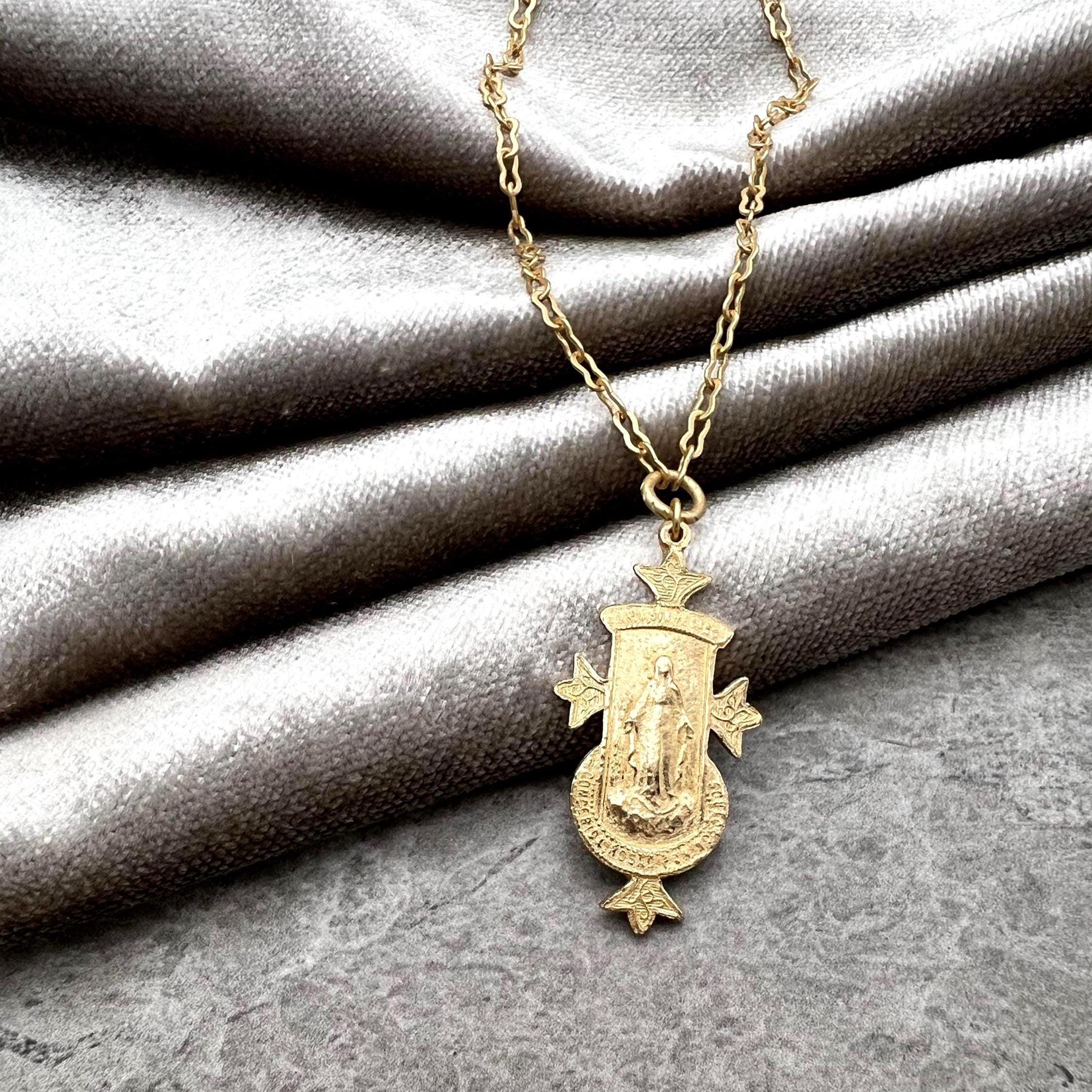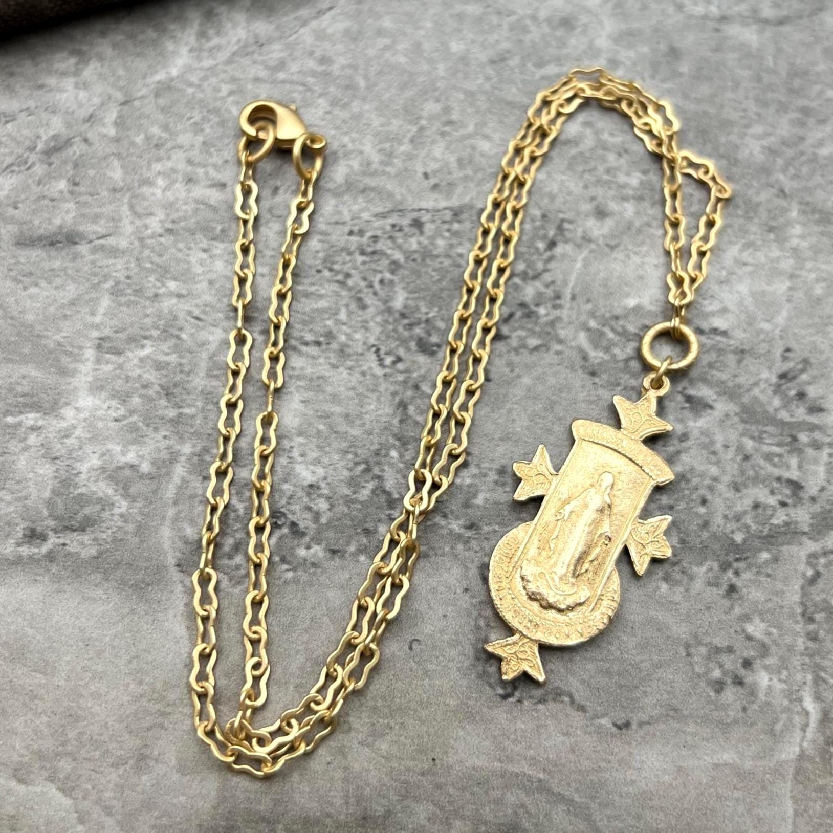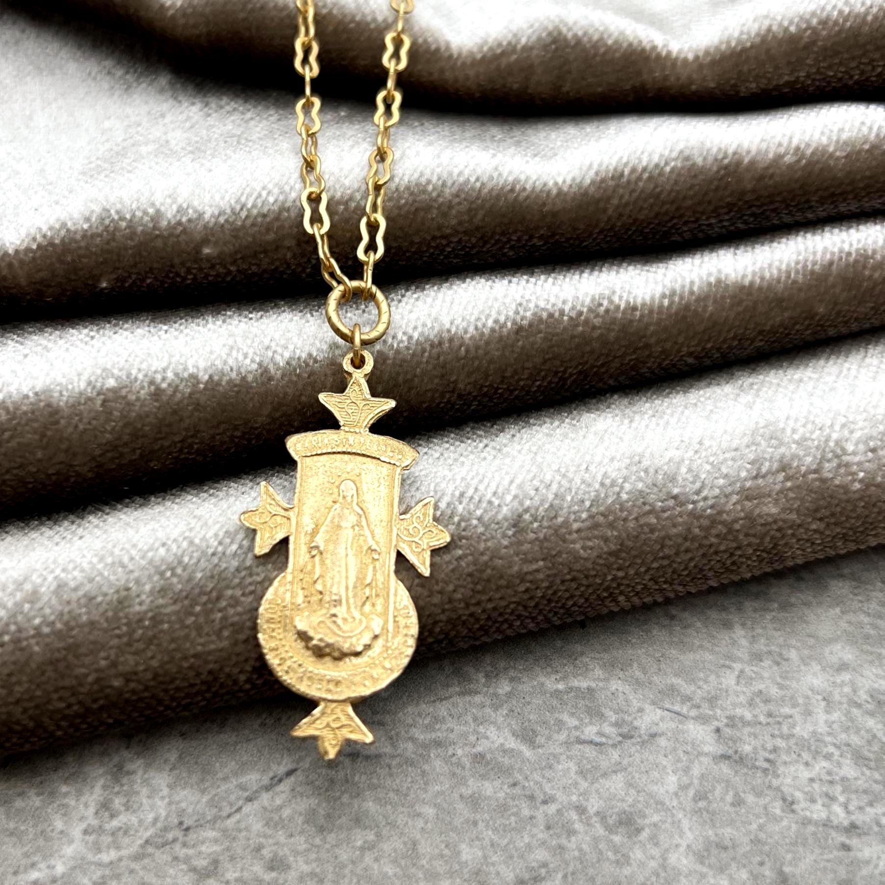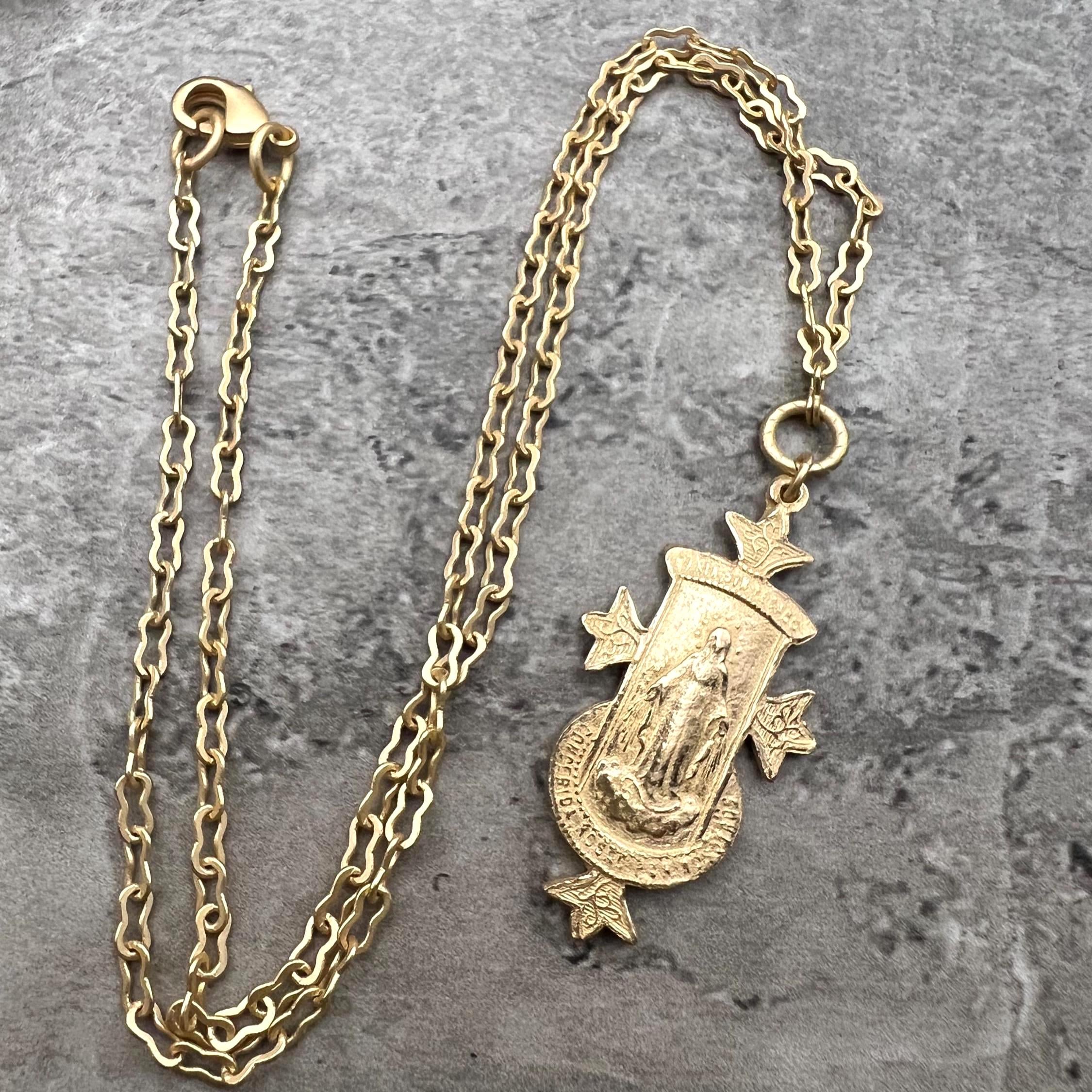 The unique antique replica of this Catholic medal is my favorite! It’s a lovely bronze clay depiction of the Miraculous Mary and is sure to be a conversation piece! The original aluminum medal was acquired from Uruguay, South America. It looks lustrous in matte gold! The classic link chain completes this necklace. Great unique gift!