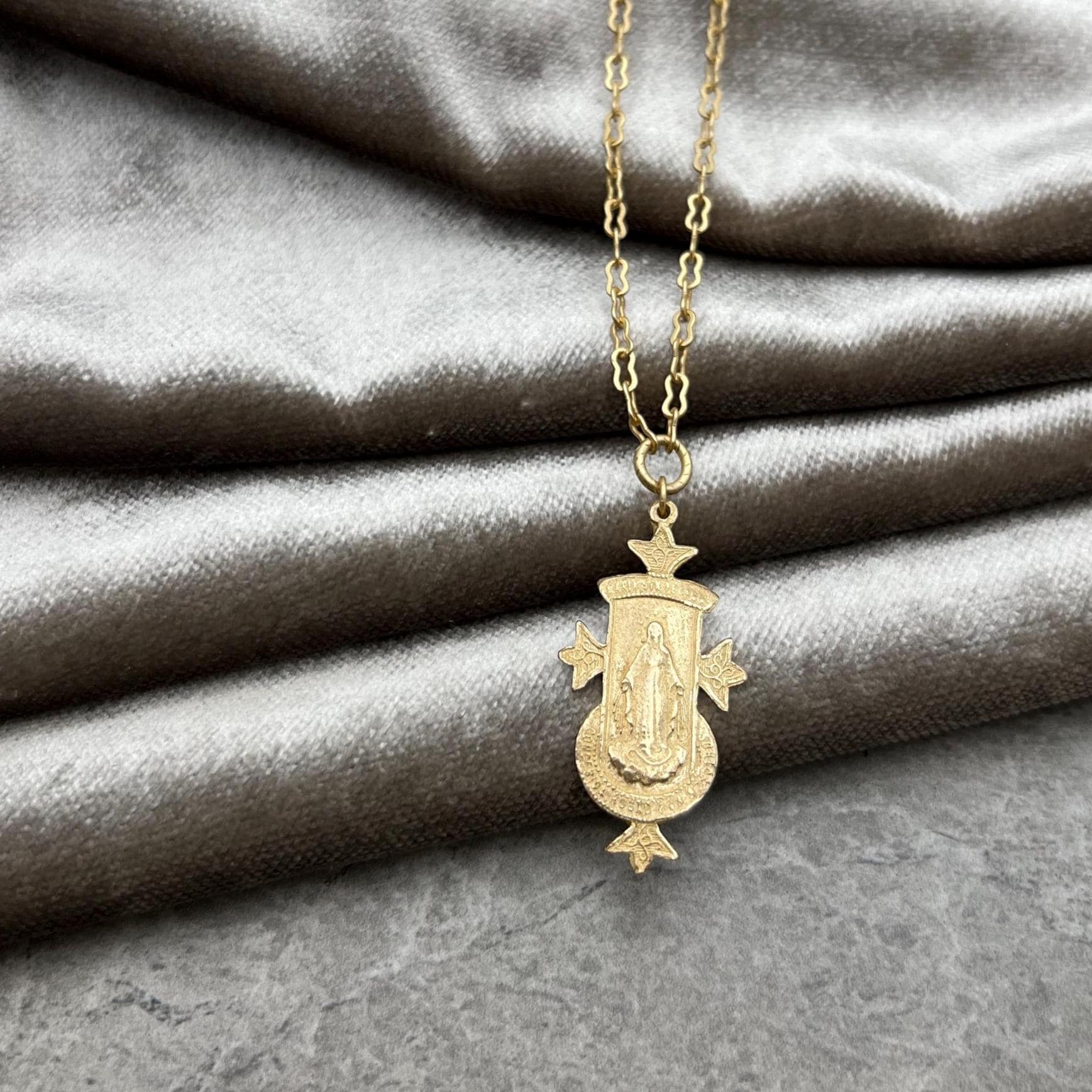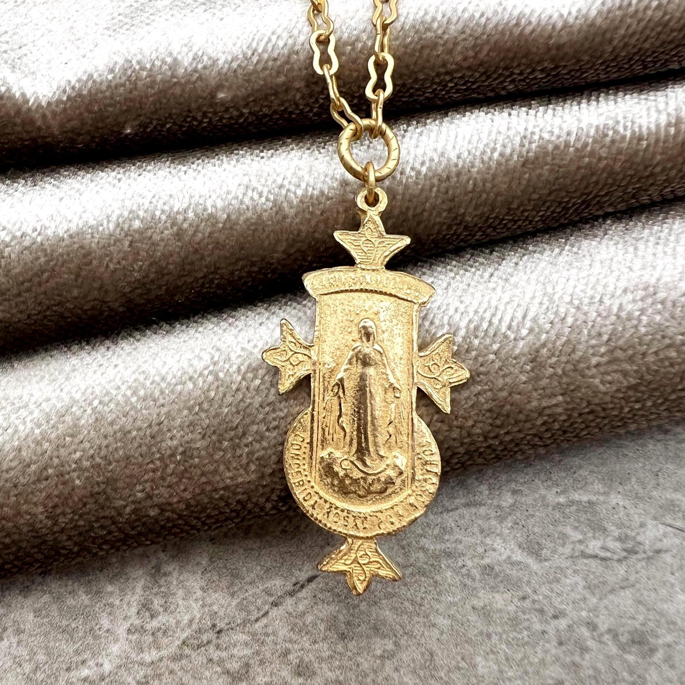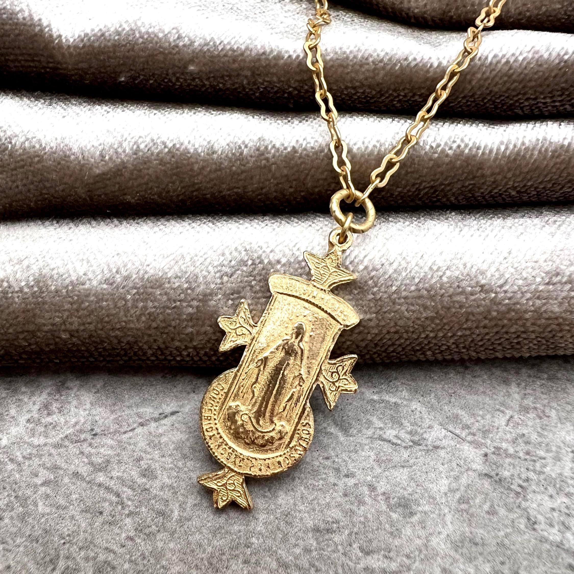 The unique antique replica of this Catholic medal is my favorite! It’s a lovely bronze clay depiction of the Miraculous Mary and is sure to be a conversation piece! The original aluminum medal was acquired from Uruguay, South America. It looks lustrous in matte gold! The classic link chain completes this necklace. Great unique gift!