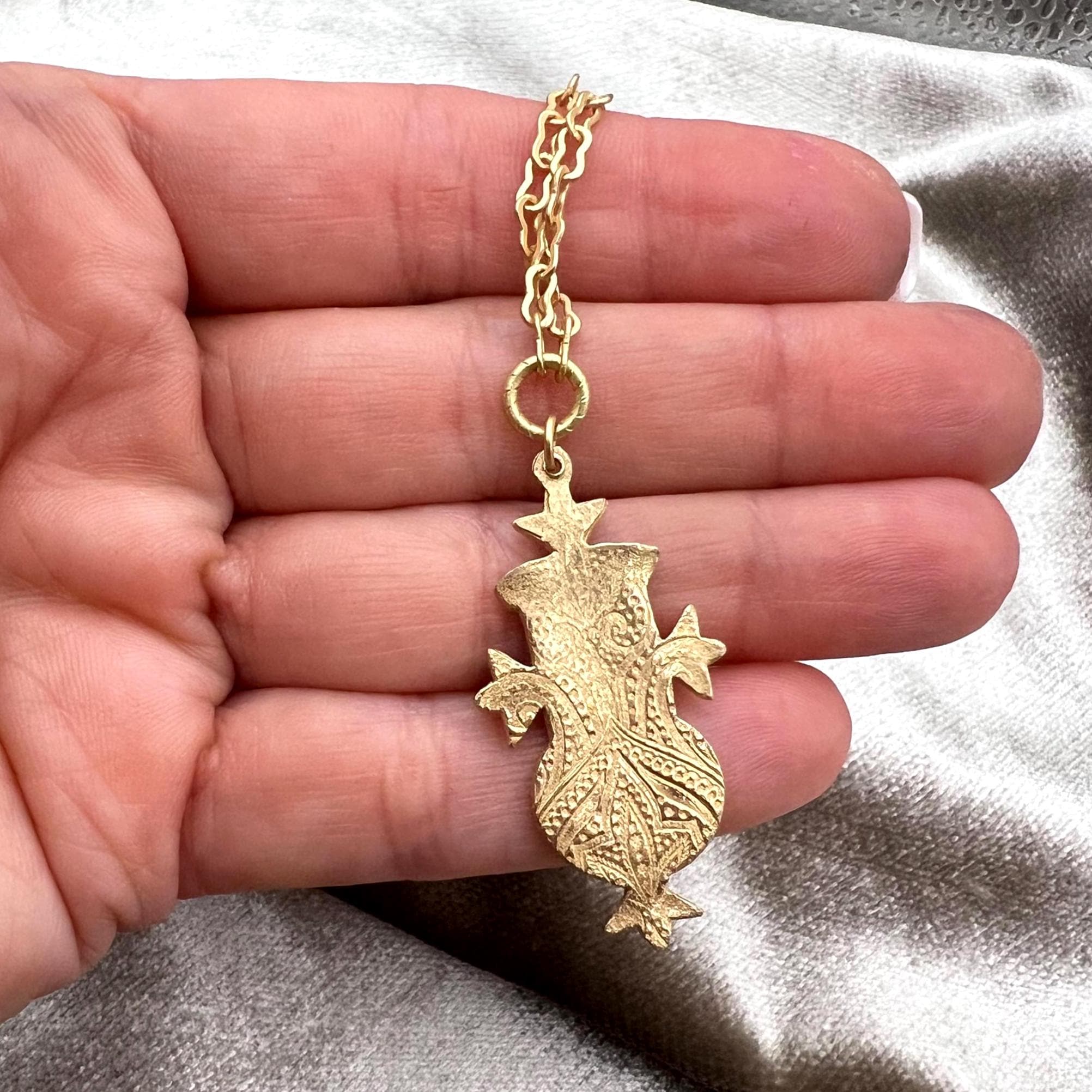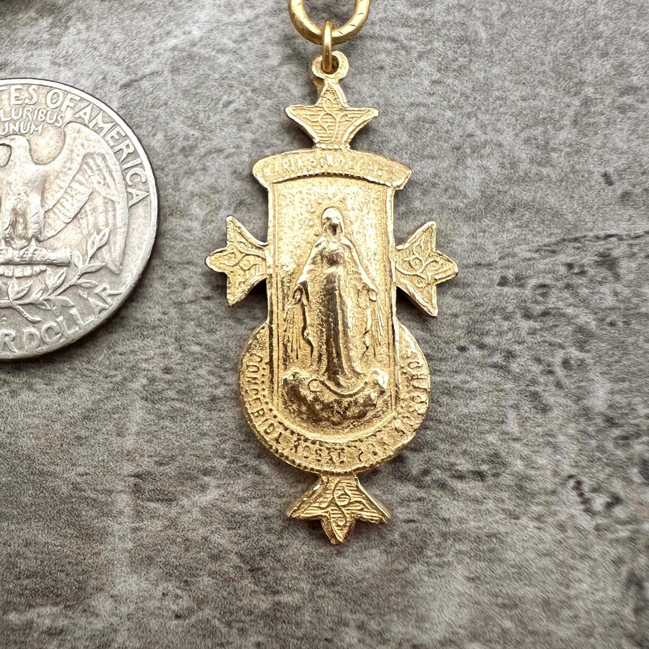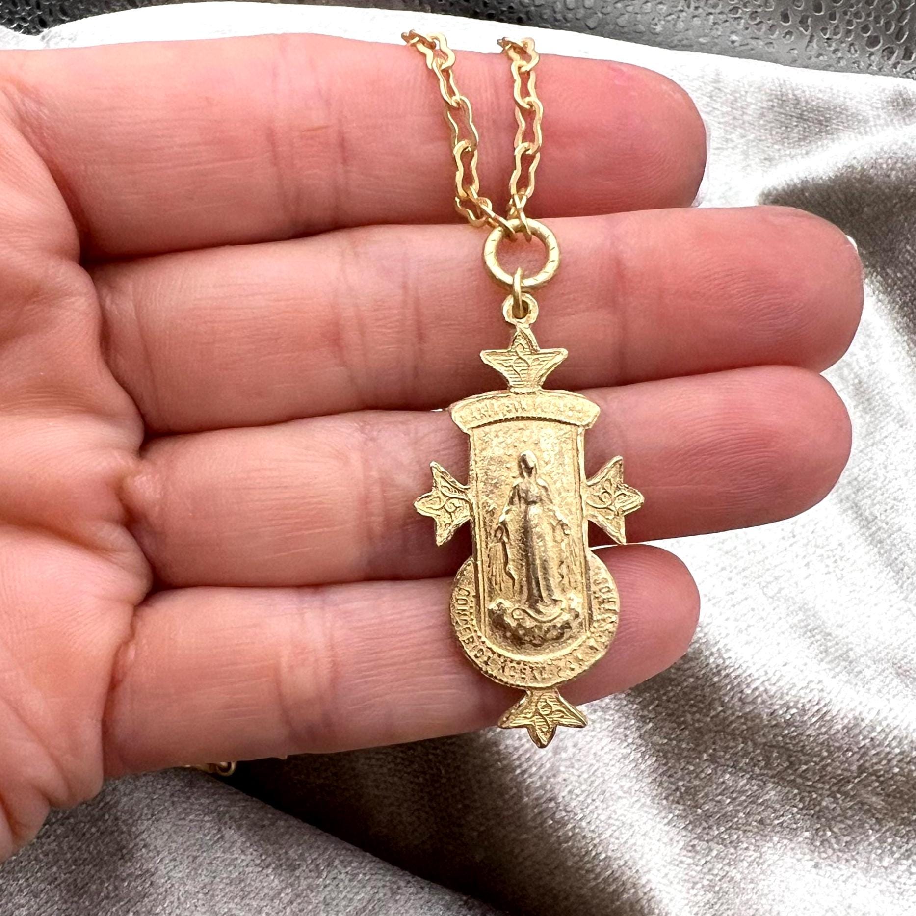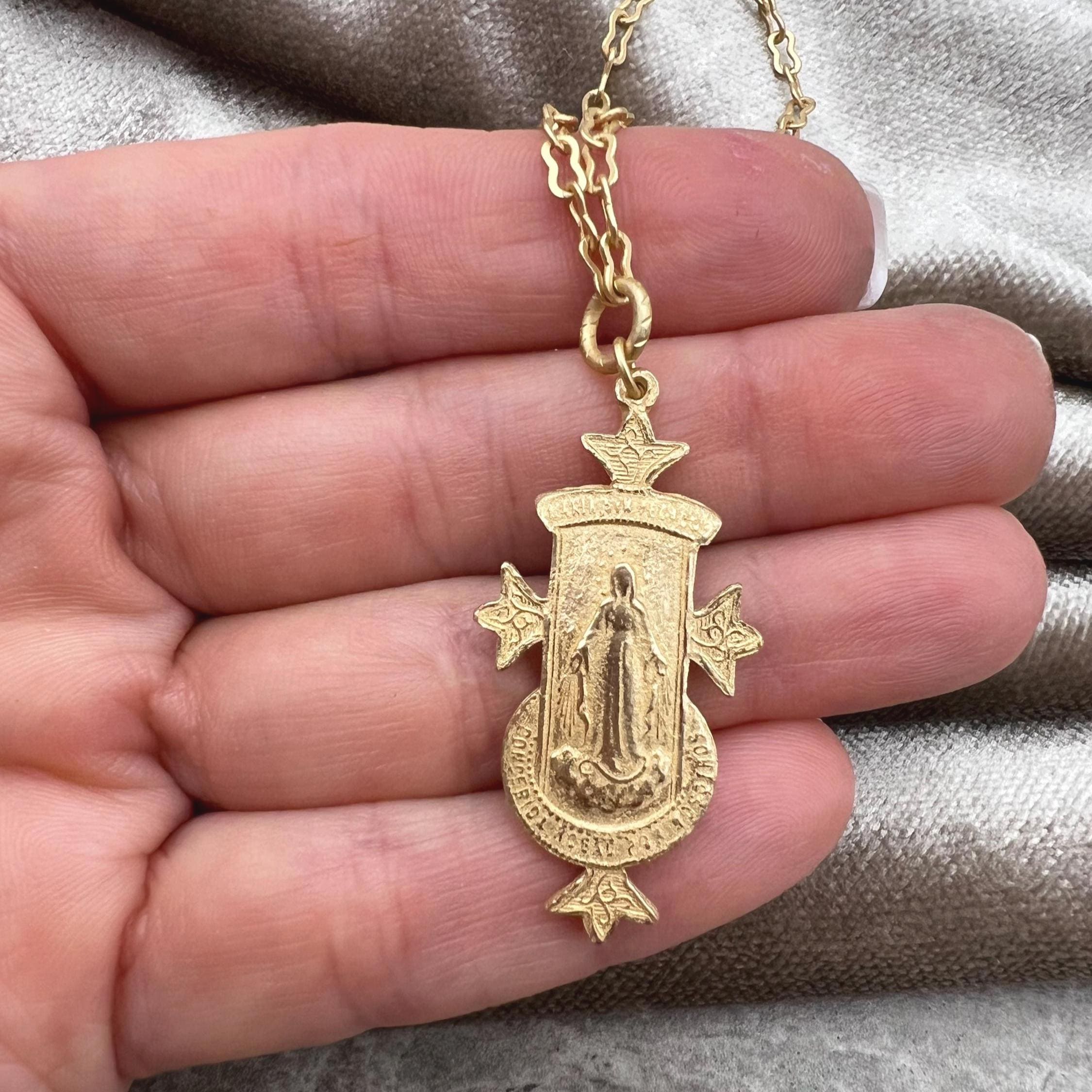 The unique antique replica of this Catholic medal is my favorite! It’s a lovely bronze clay depiction of the Miraculous Mary and is sure to be a conversation piece! The original aluminum medal was acquired from Uruguay, South America. It looks lustrous in matte gold! The classic link chain completes this necklace. Great unique gift!