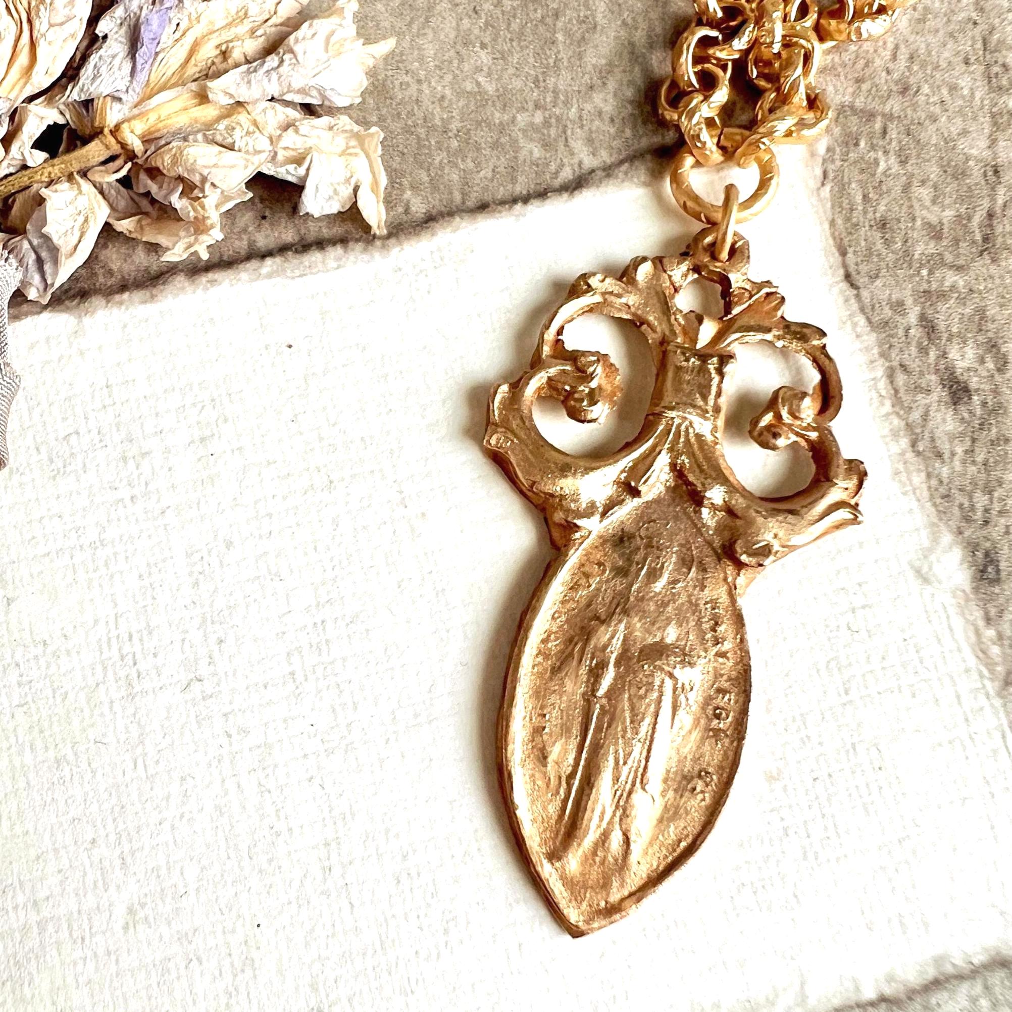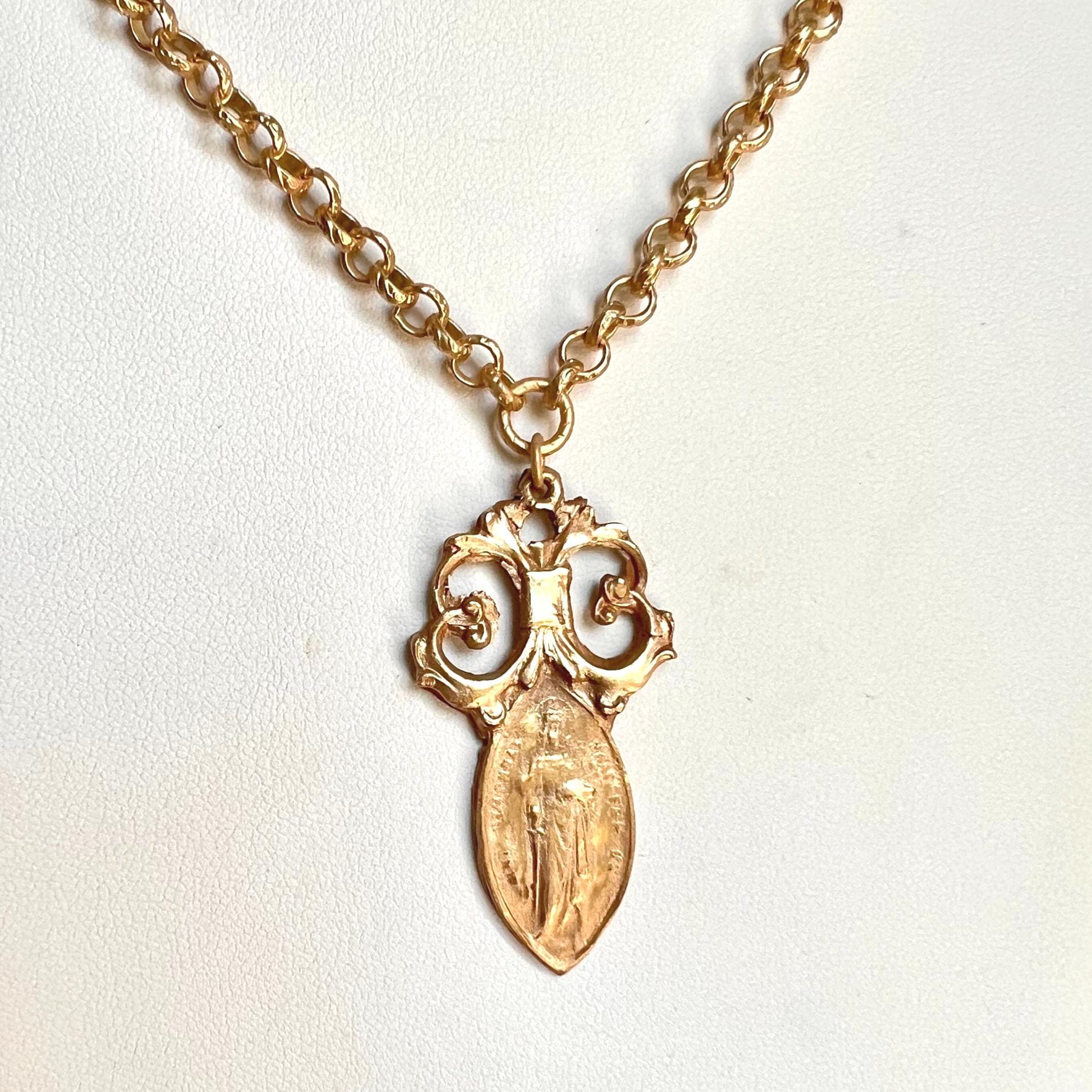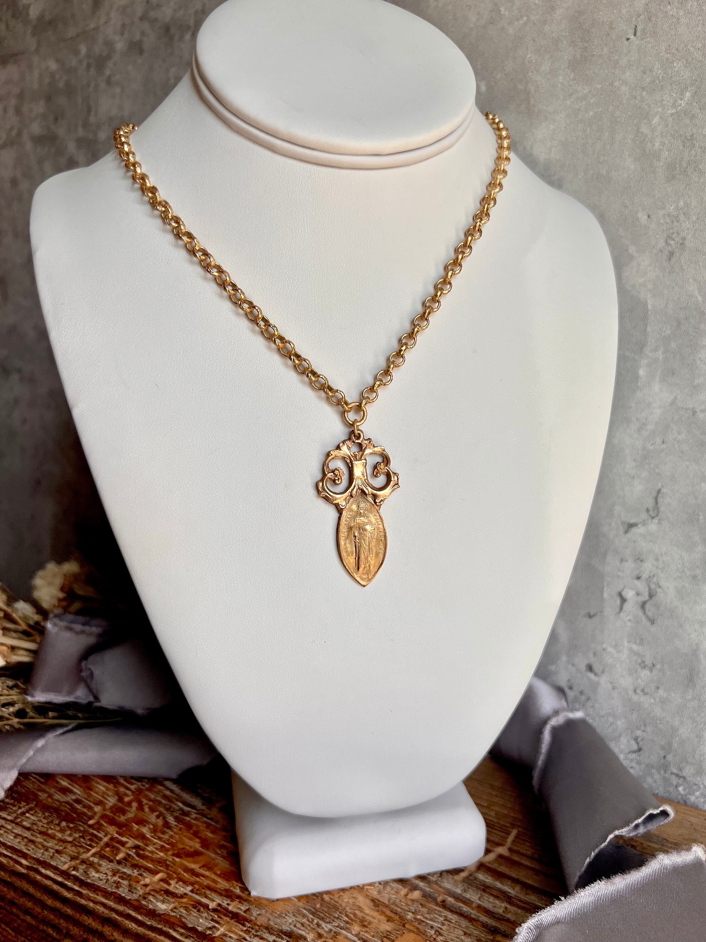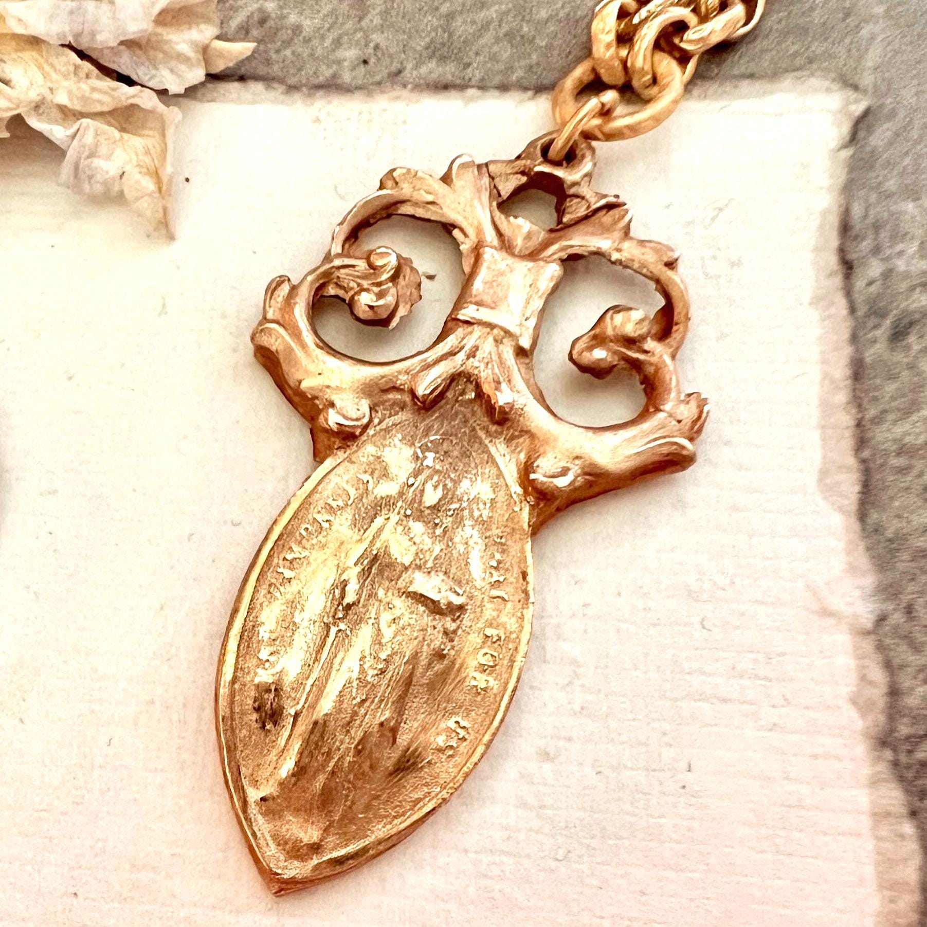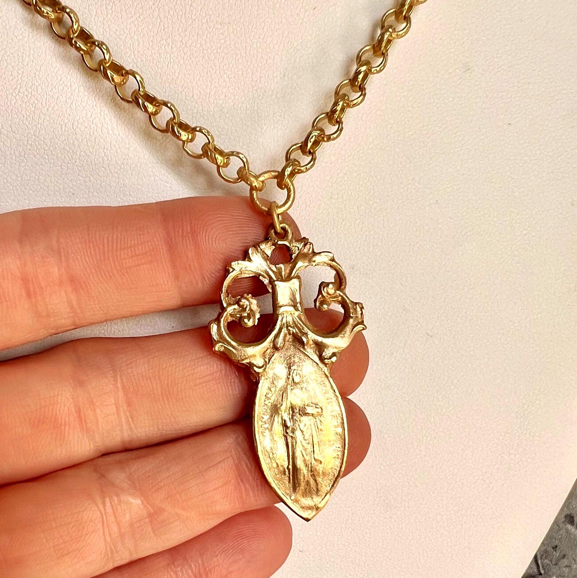 This is a unique depiction of Saint Dymphna with a Victorian scroll accent. I have found it difficult to find images of St Dymphna so I hope that you love this new design. This medal is unique to the Crown of Grace collection and was made by incorporating two century old parts. This antique replica medal was hand made out of bronze clay in my studio and is finished with a technique to give it a baroque style gold finish. It is paired with an etched rolo antique style non tarnish chain with Lobster claw closure.