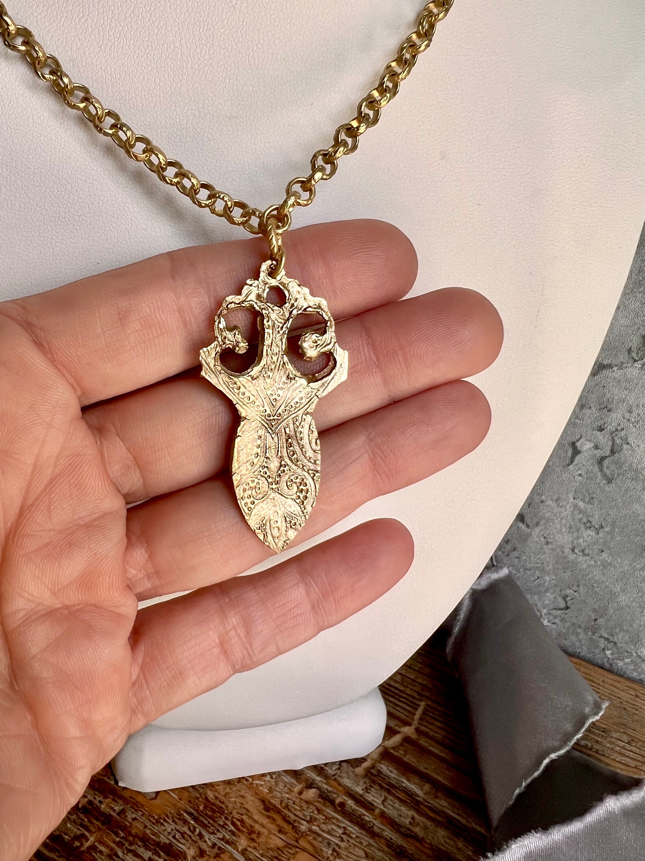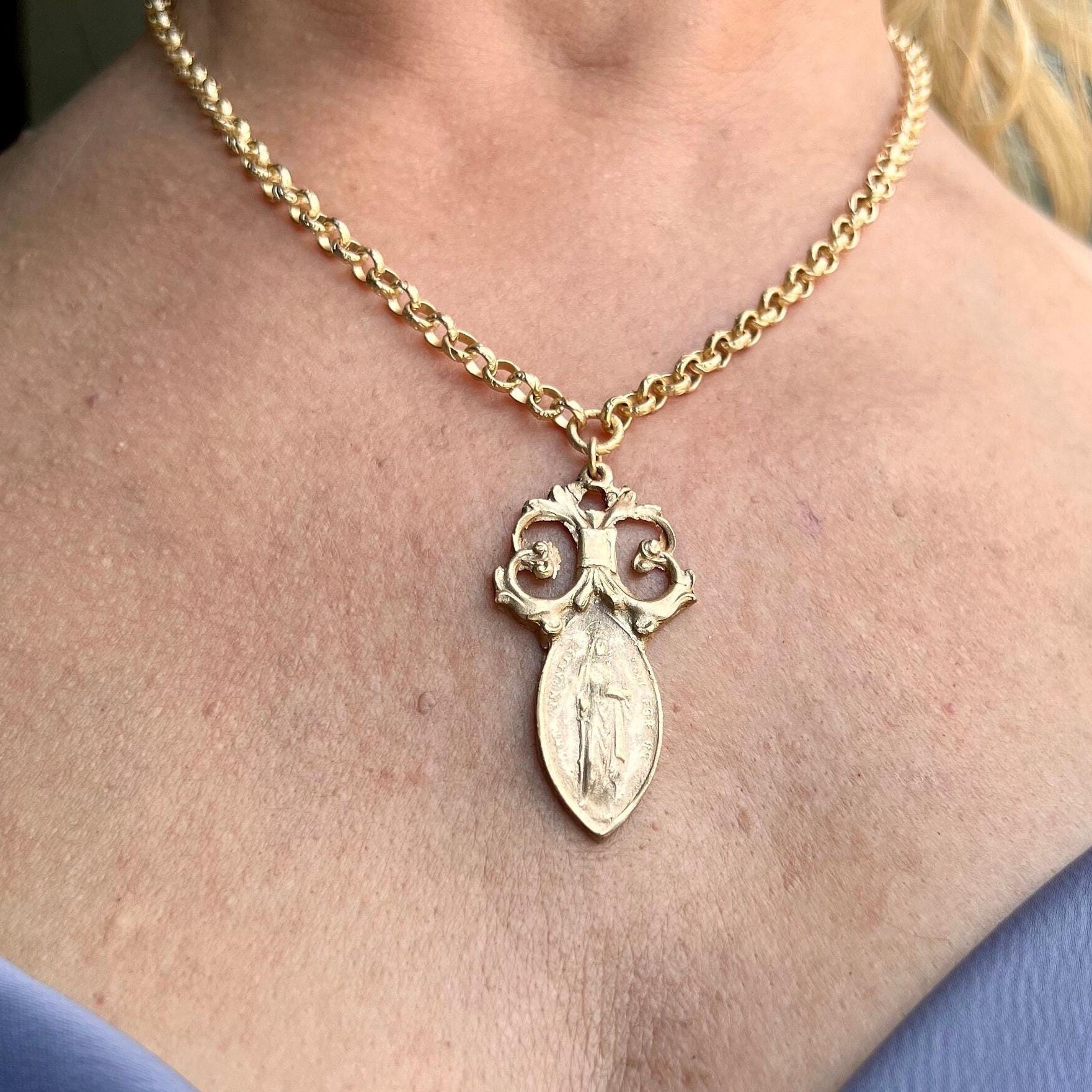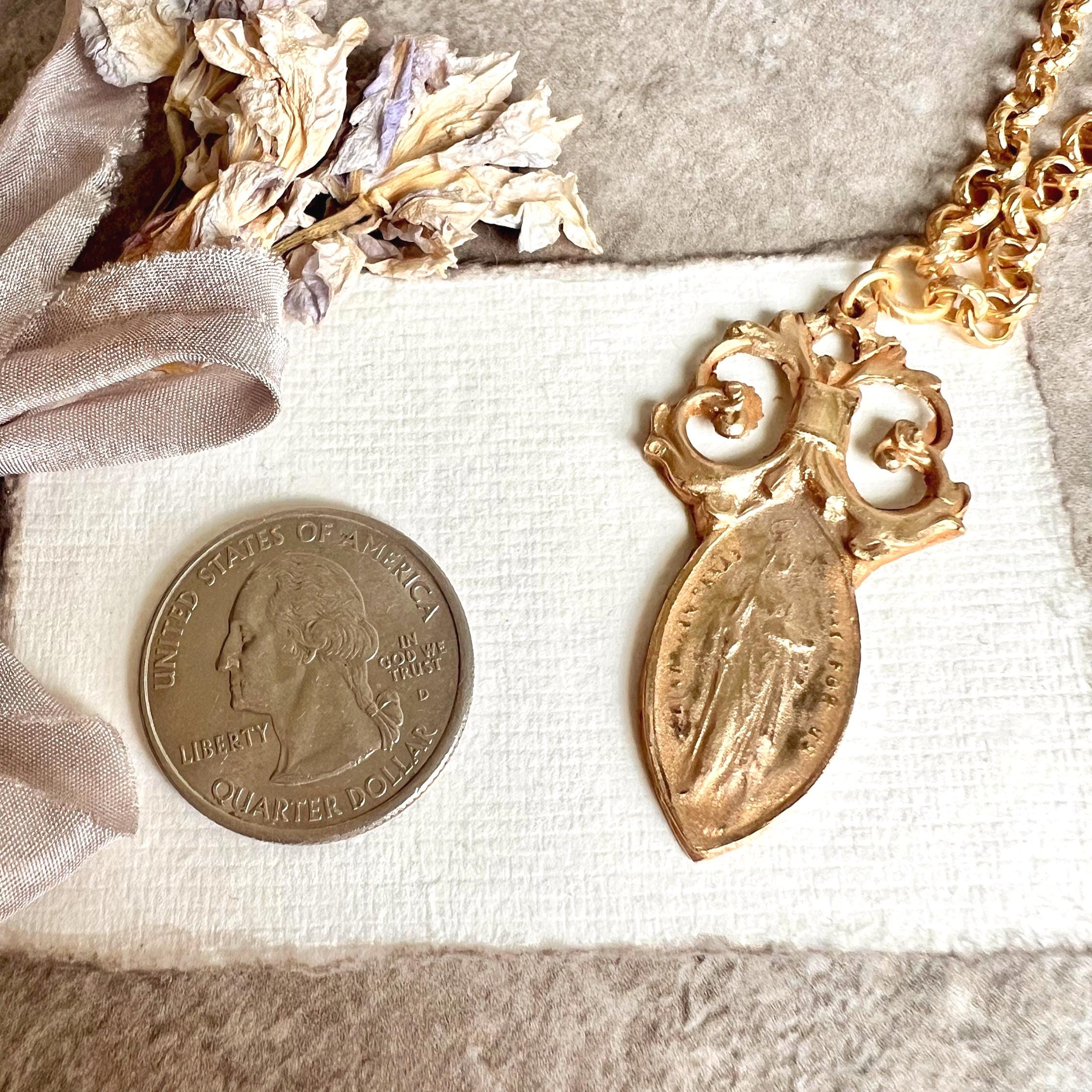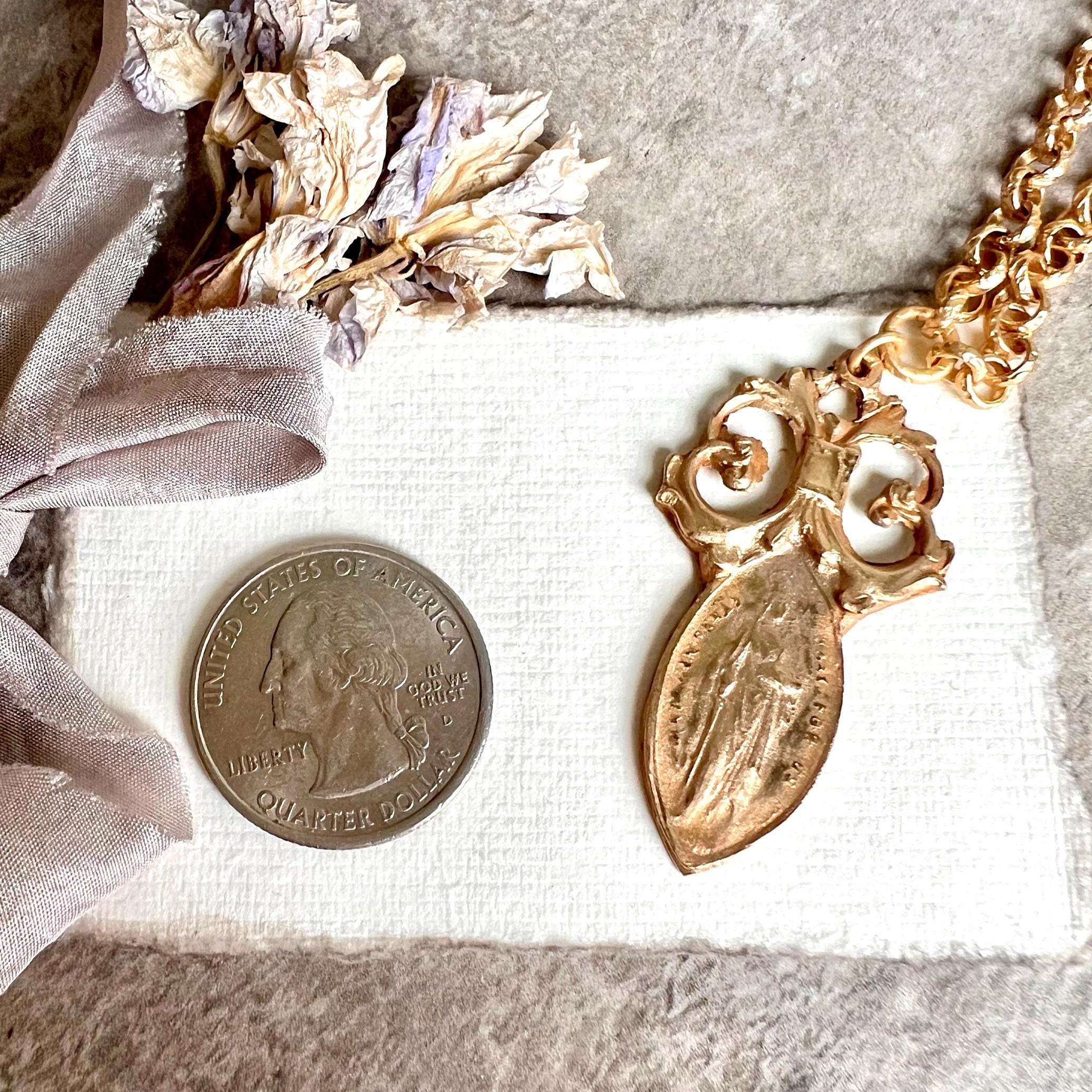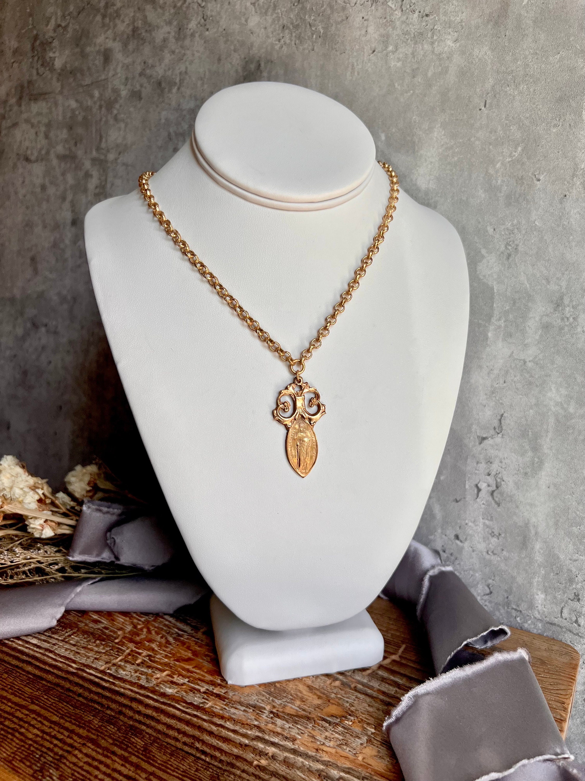 This is a unique depiction of Saint Dymphna with a Victorian scroll accent. I have found it difficult to find images of St Dymphna so I hope that you love this new design. This medal is unique to the Crown of Grace collection and was made by incorporating two century old parts. This antique replica medal was hand made out of bronze clay in my studio and is finished with a technique to give it a baroque style gold finish. It is paired with an etched rolo antique style non tarnish chain with Lobster claw closure.