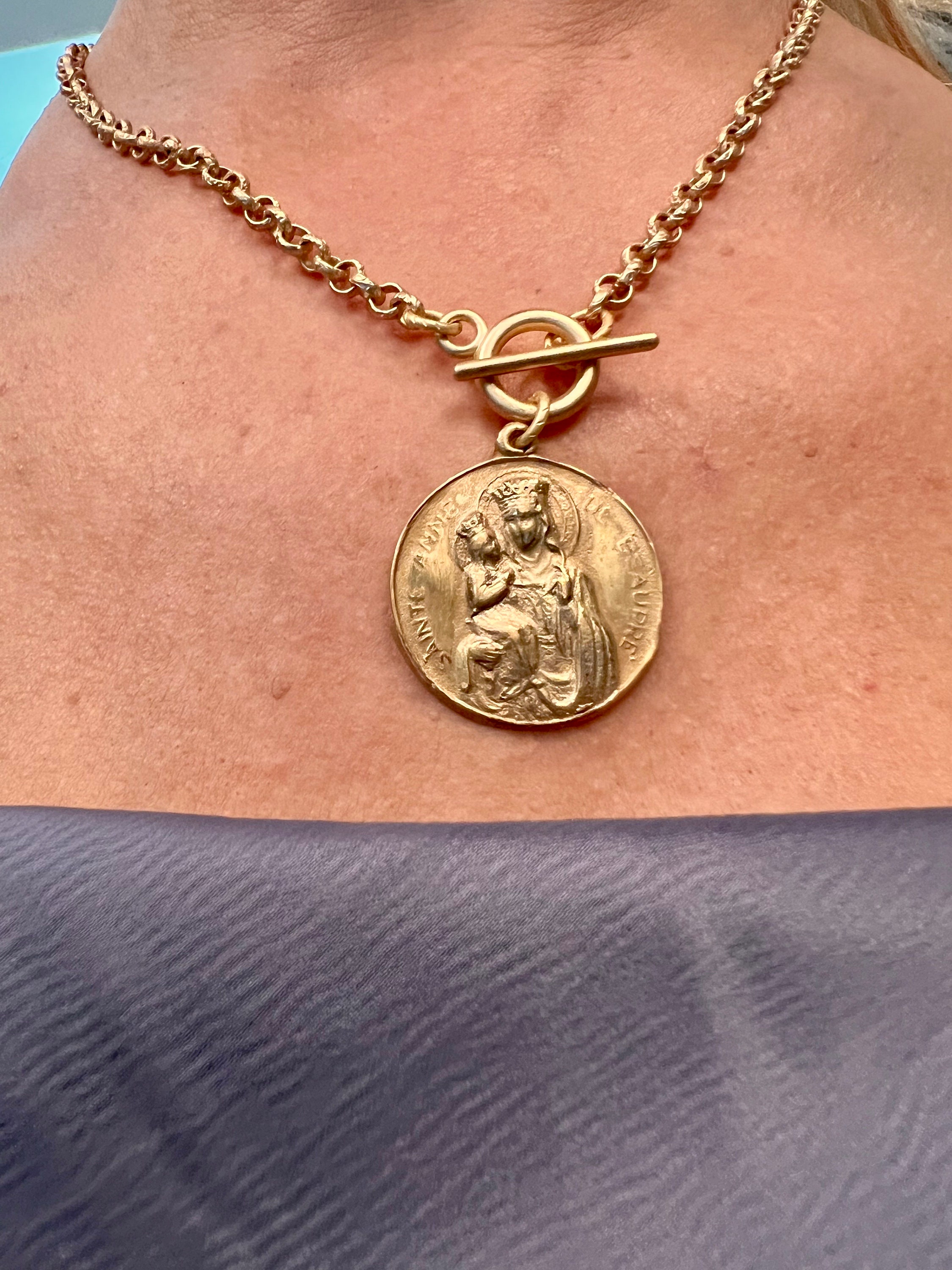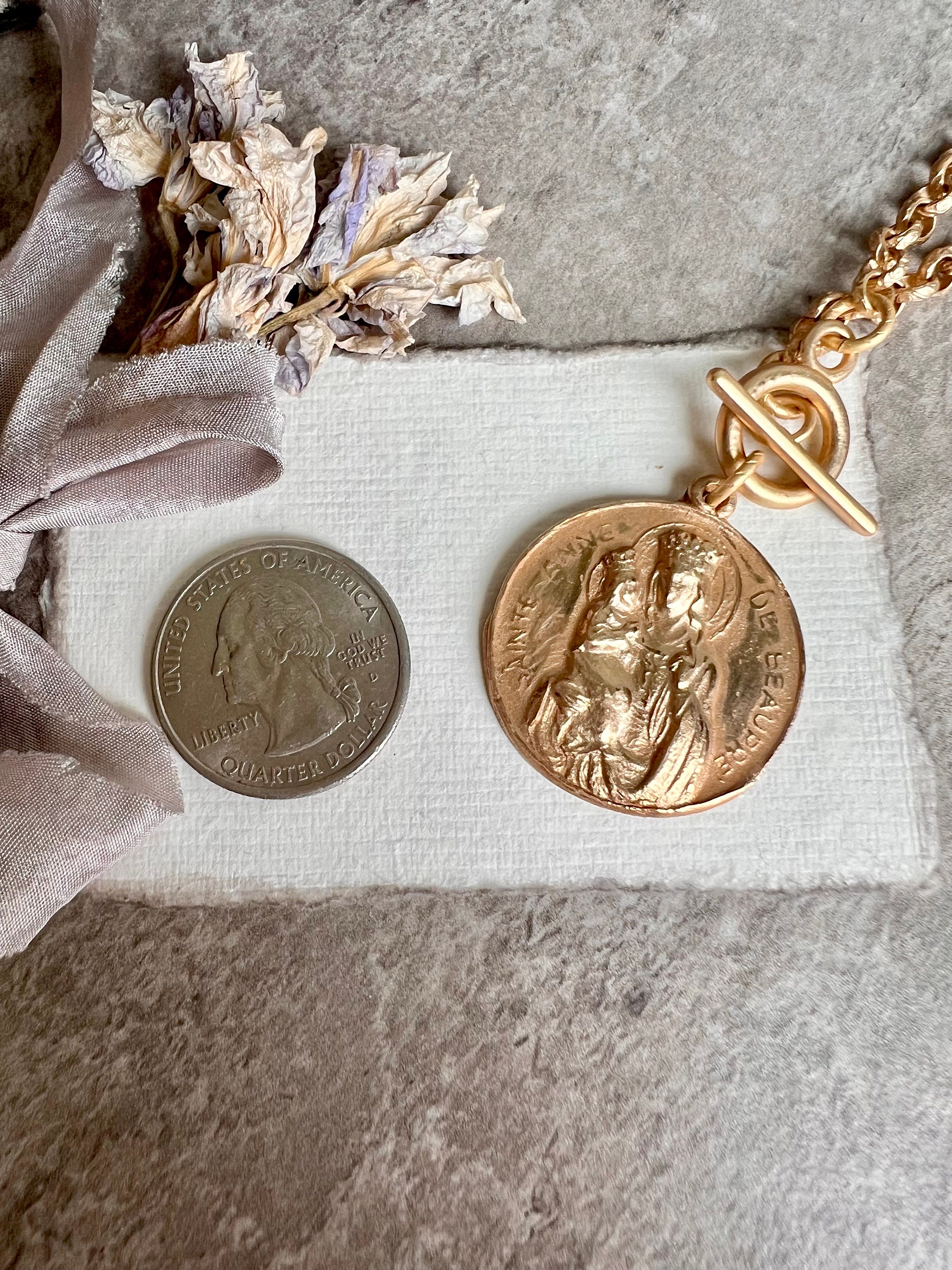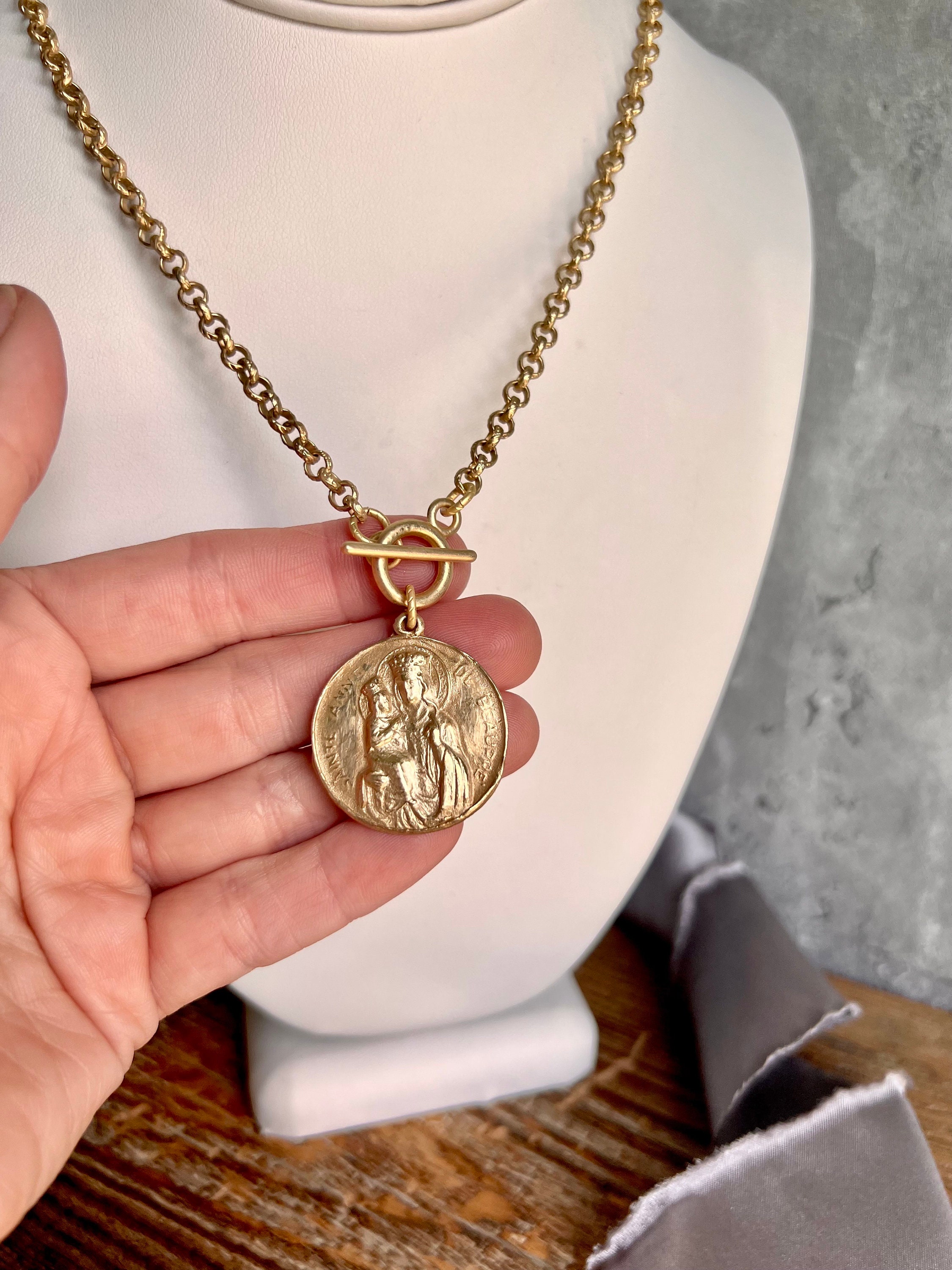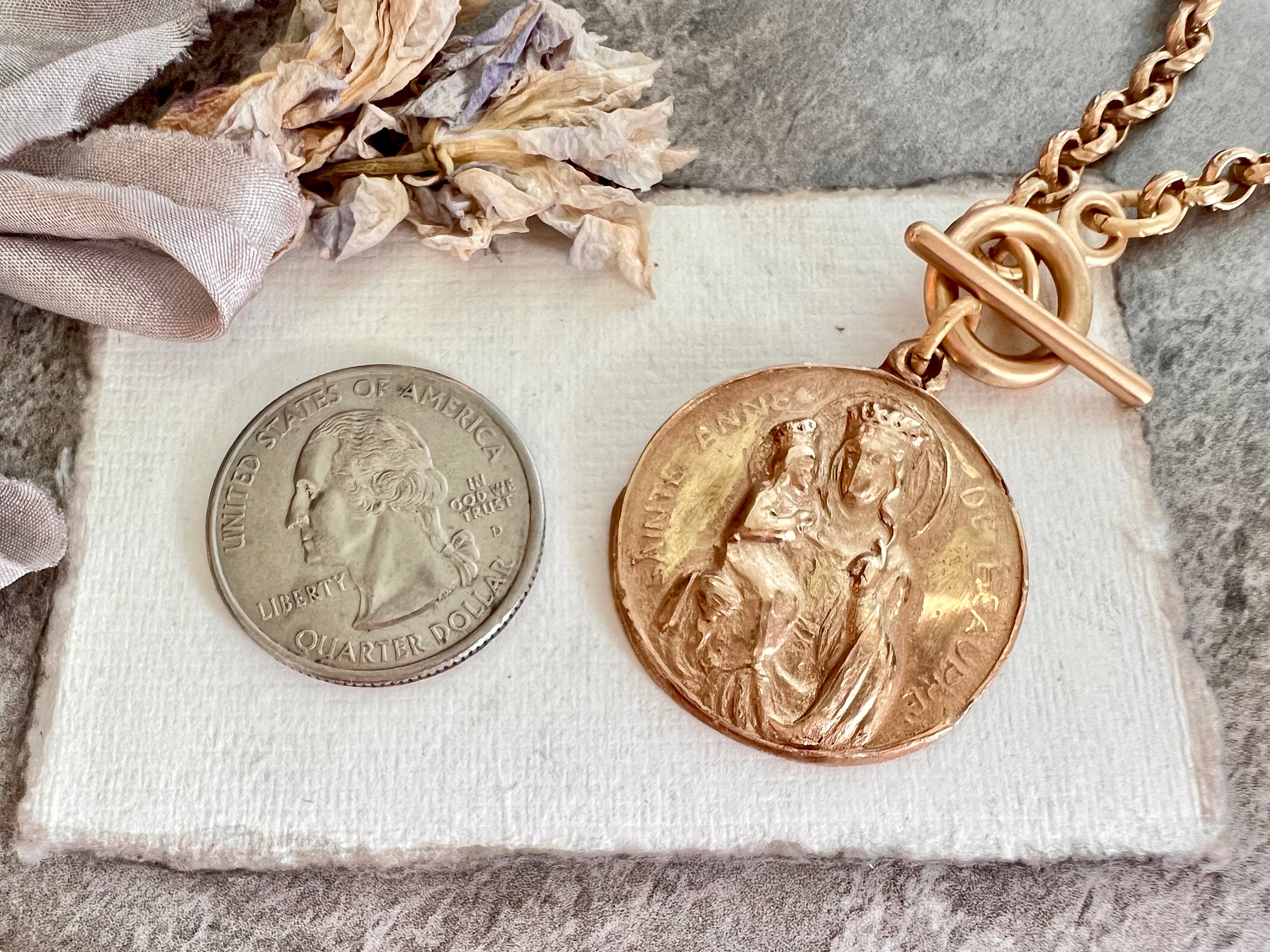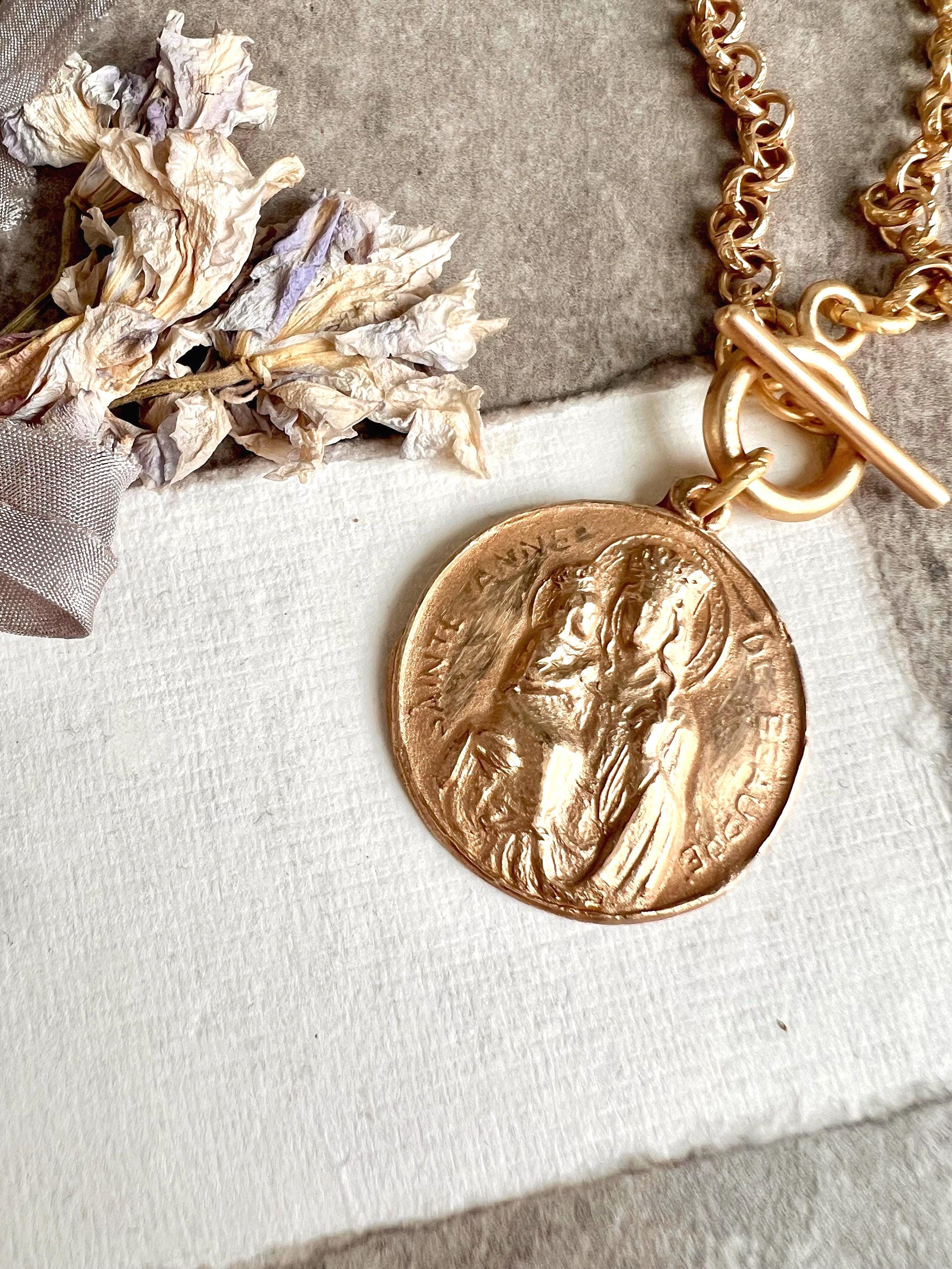 Listed is one of the most beautiful high relief depictions of Saint Anne & Mary that I have ever seen. She is the mother of Mary and is depicted in this medal with the young mother of Jesus by her side. This antique replica medal was hand made out of bronze clay in my studio and is finished with a technique to give it a baroque style gold finish. It is paired with an etched rolo antique style non tarnish chain and timeless front toggle.