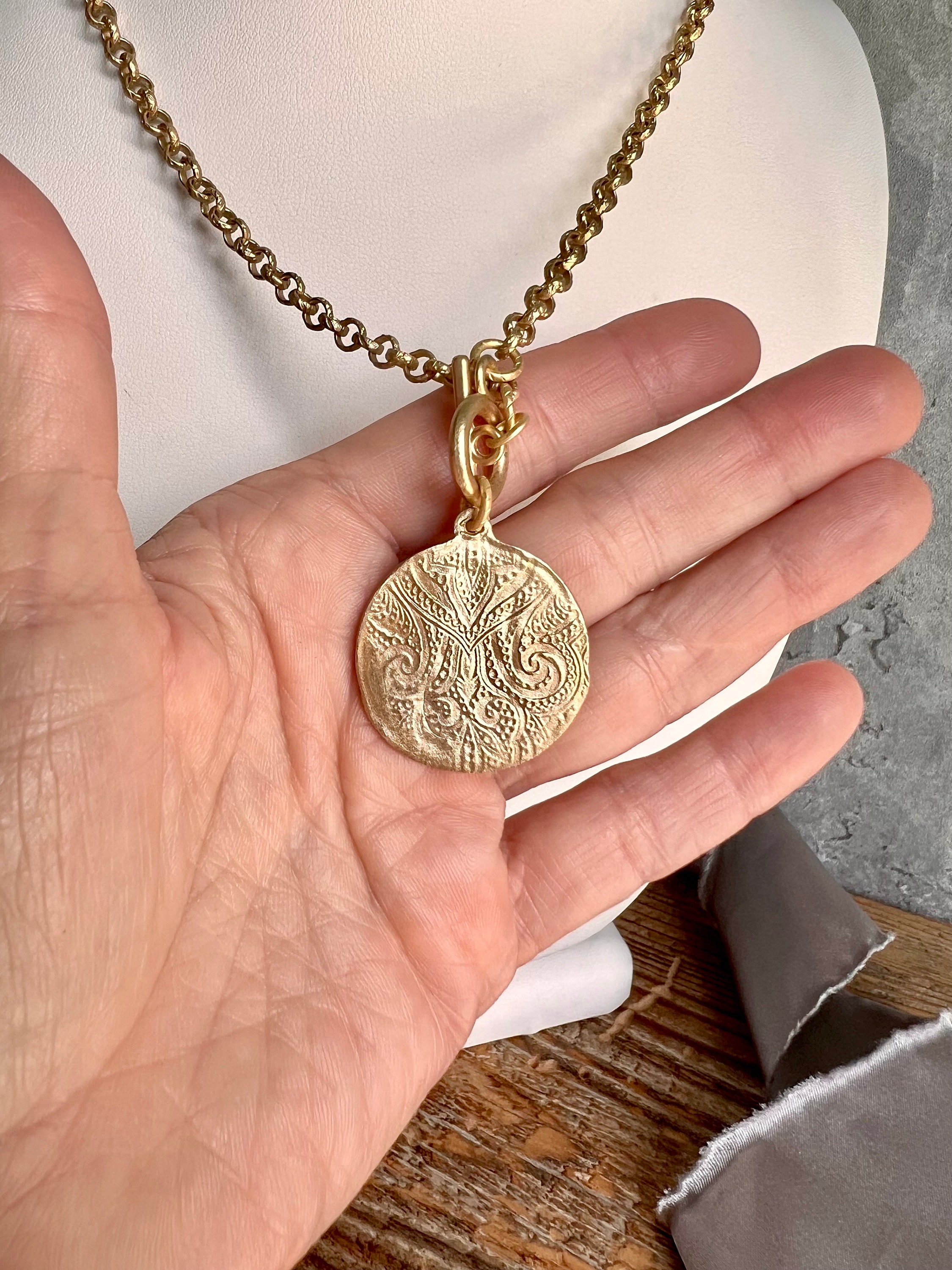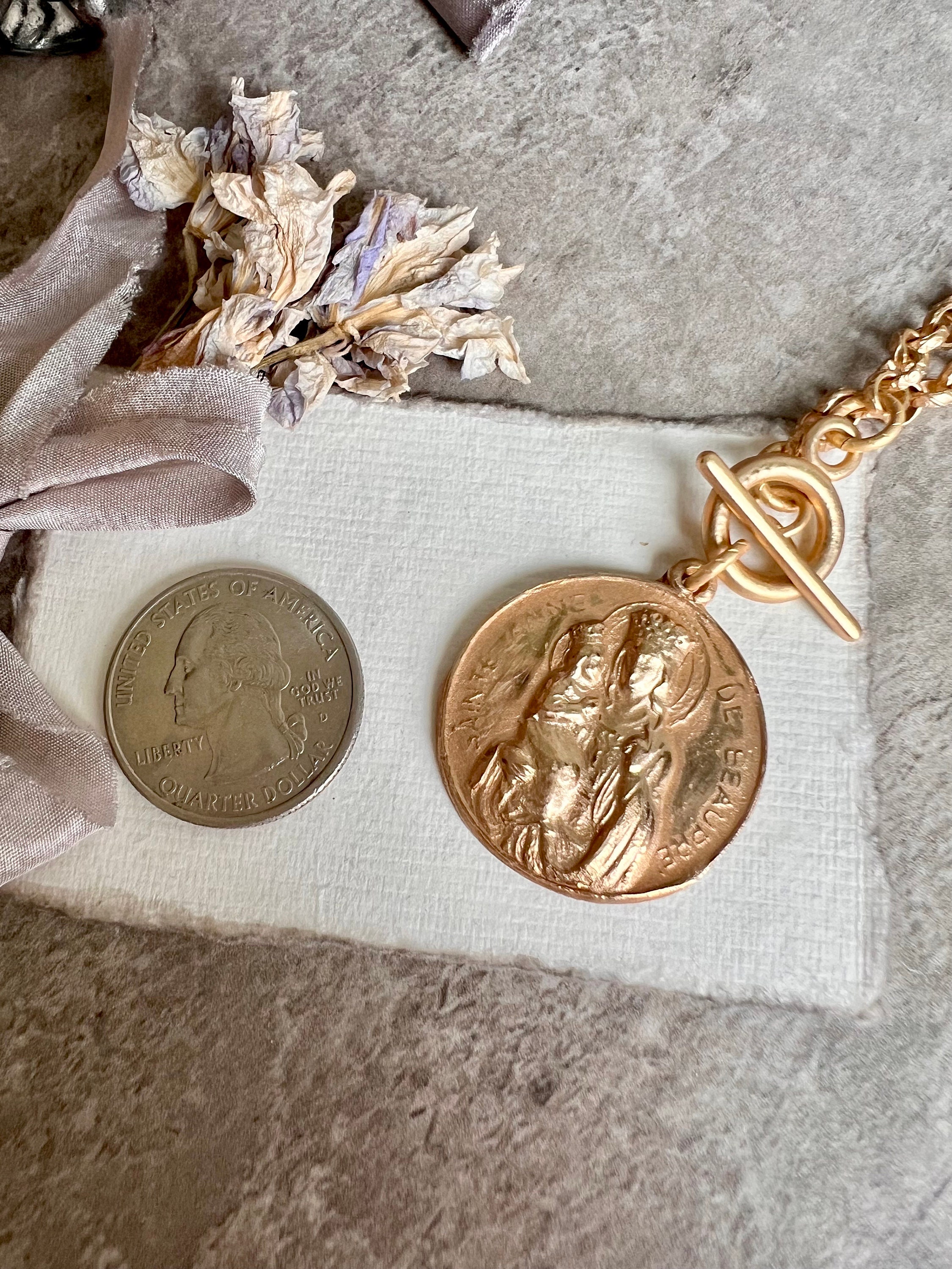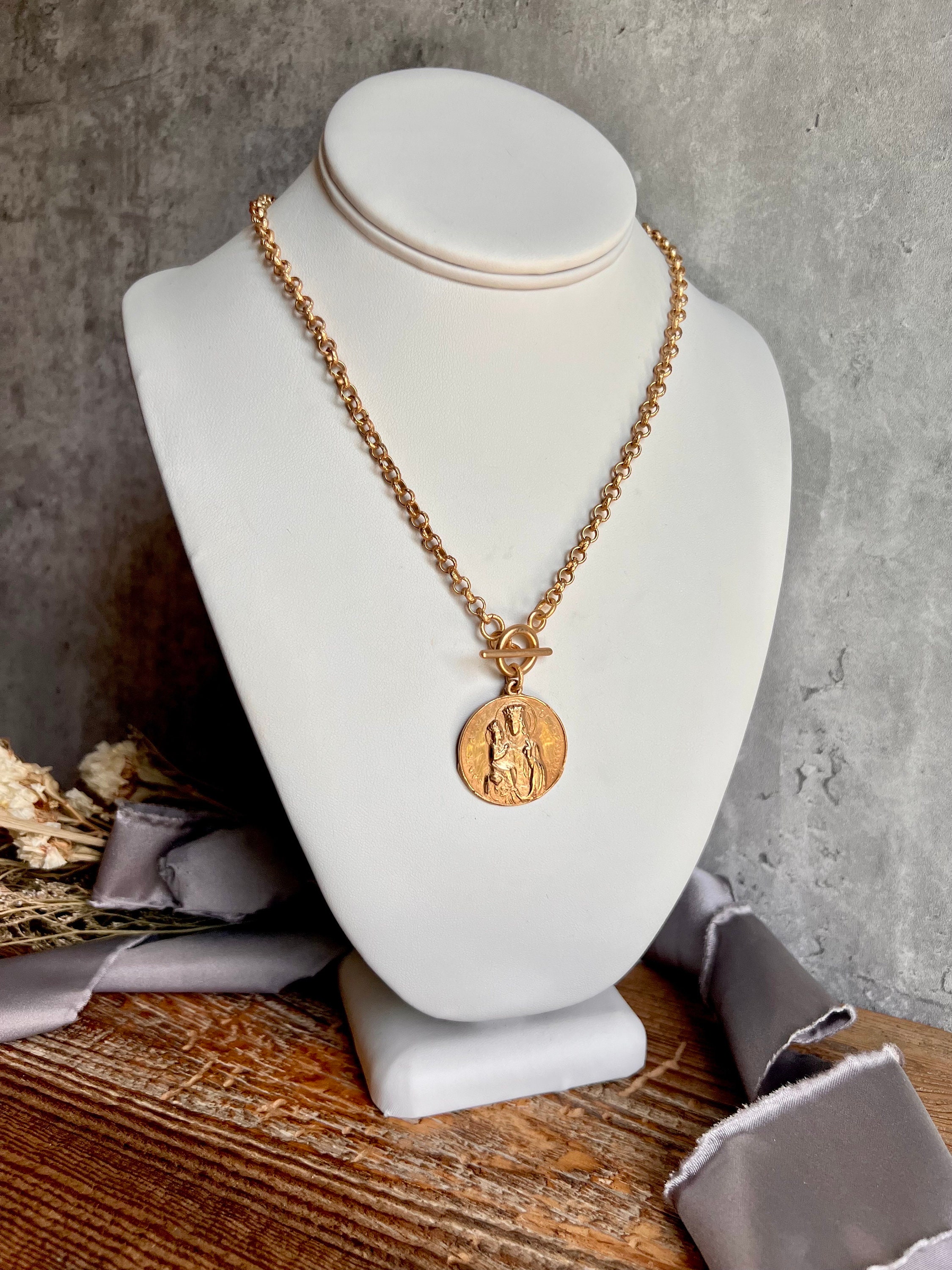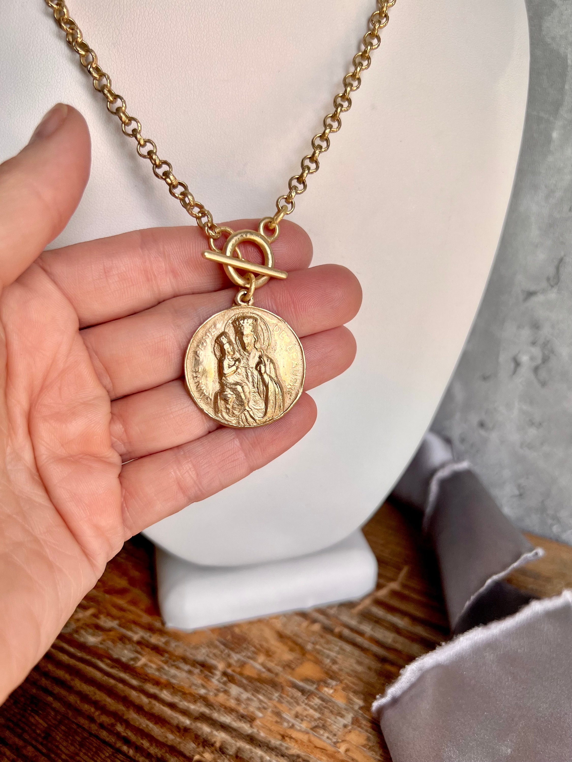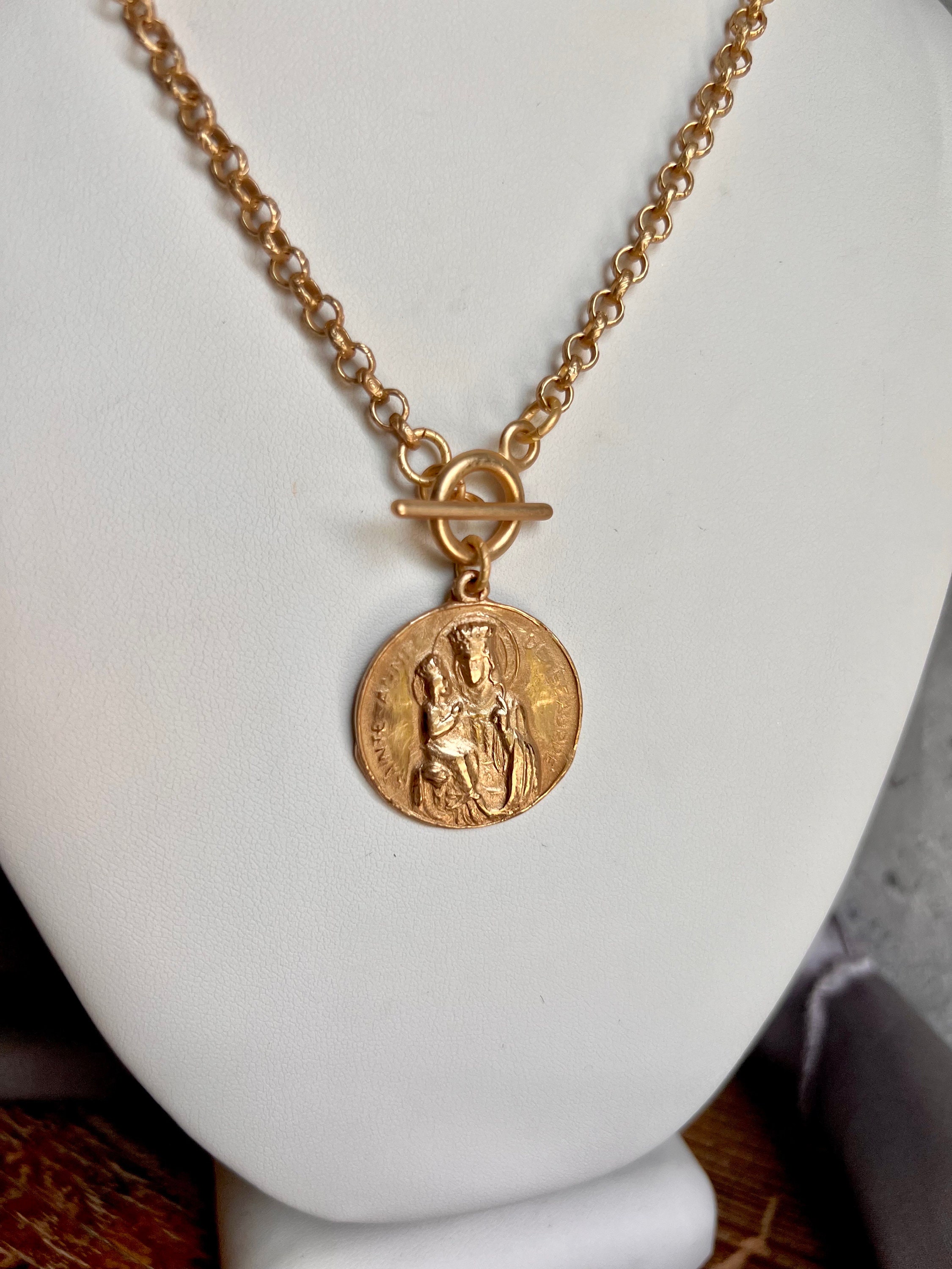Listed is one of the most beautiful high relief depictions of Saint Anne & Mary that I have ever seen. She is the mother of Mary and is depicted in this medal with the young mother of Jesus by her side. This antique replica medal was hand made out of bronze clay in my studio and is finished with a technique to give it a baroque style gold finish. It is paired with an etched rolo antique style non tarnish chain and timeless front toggle.