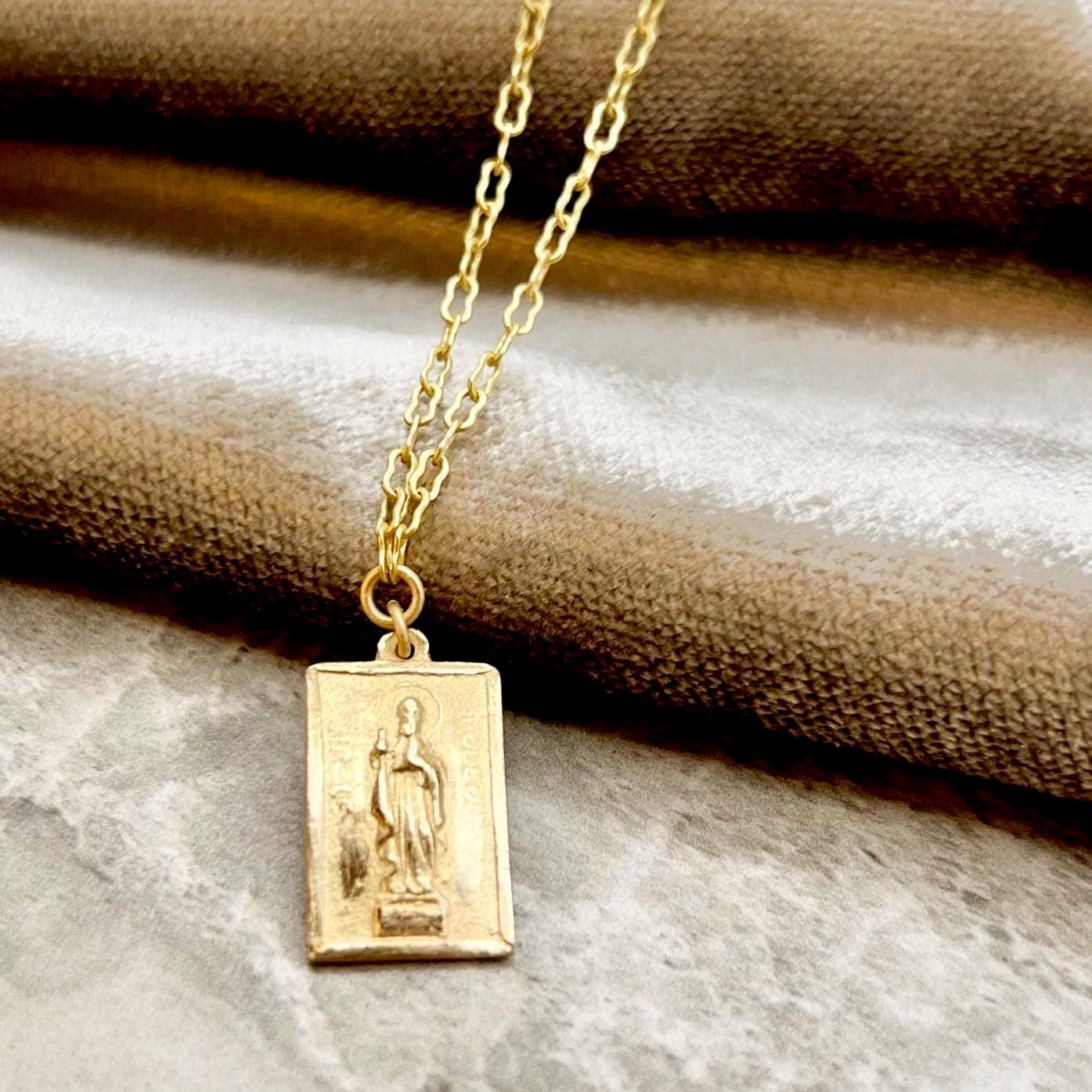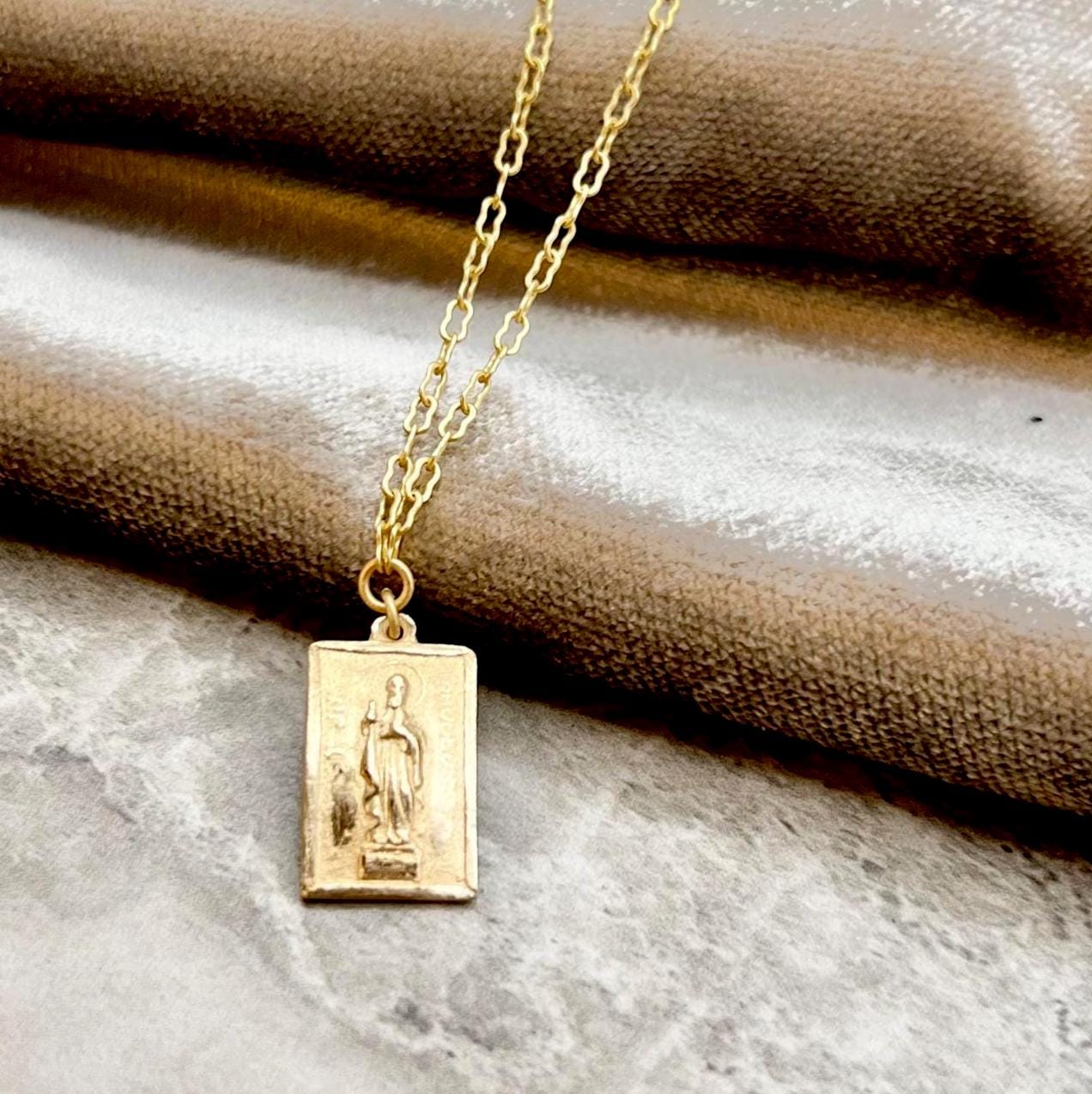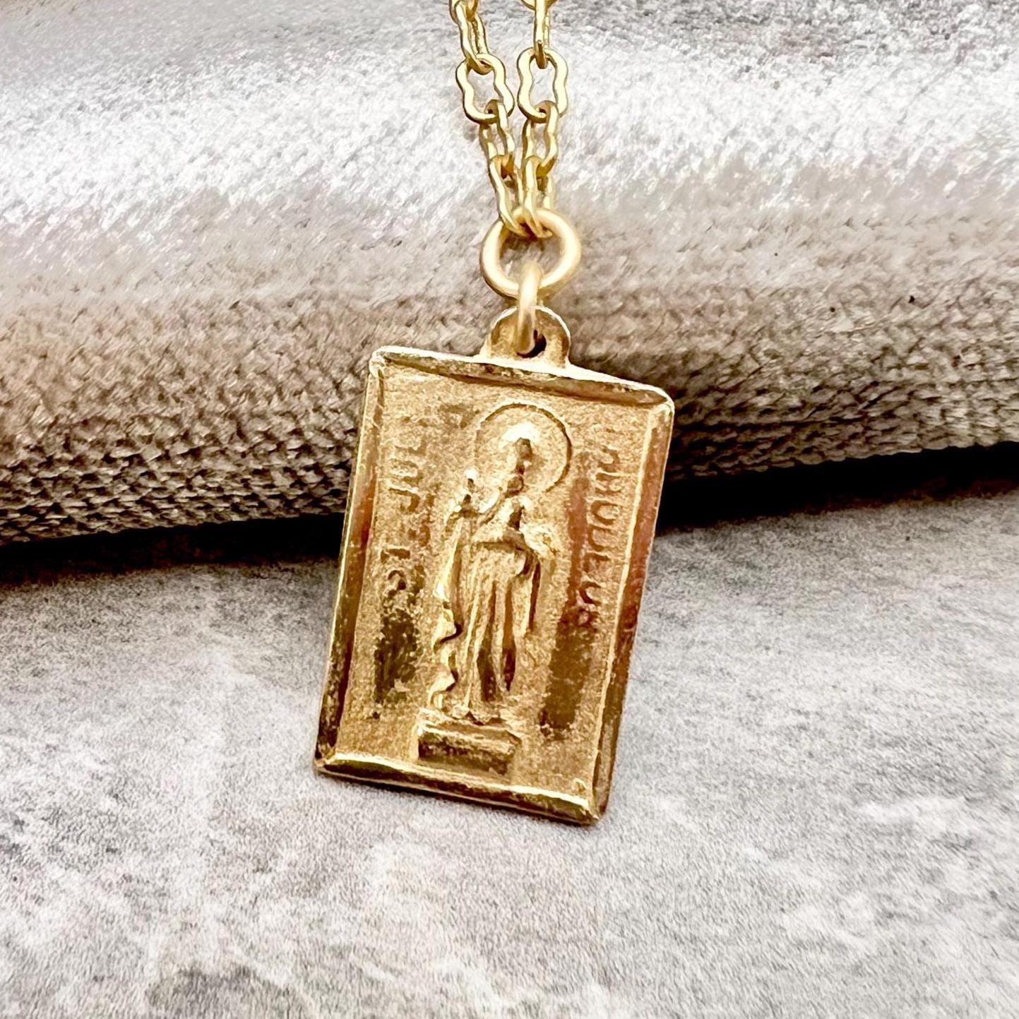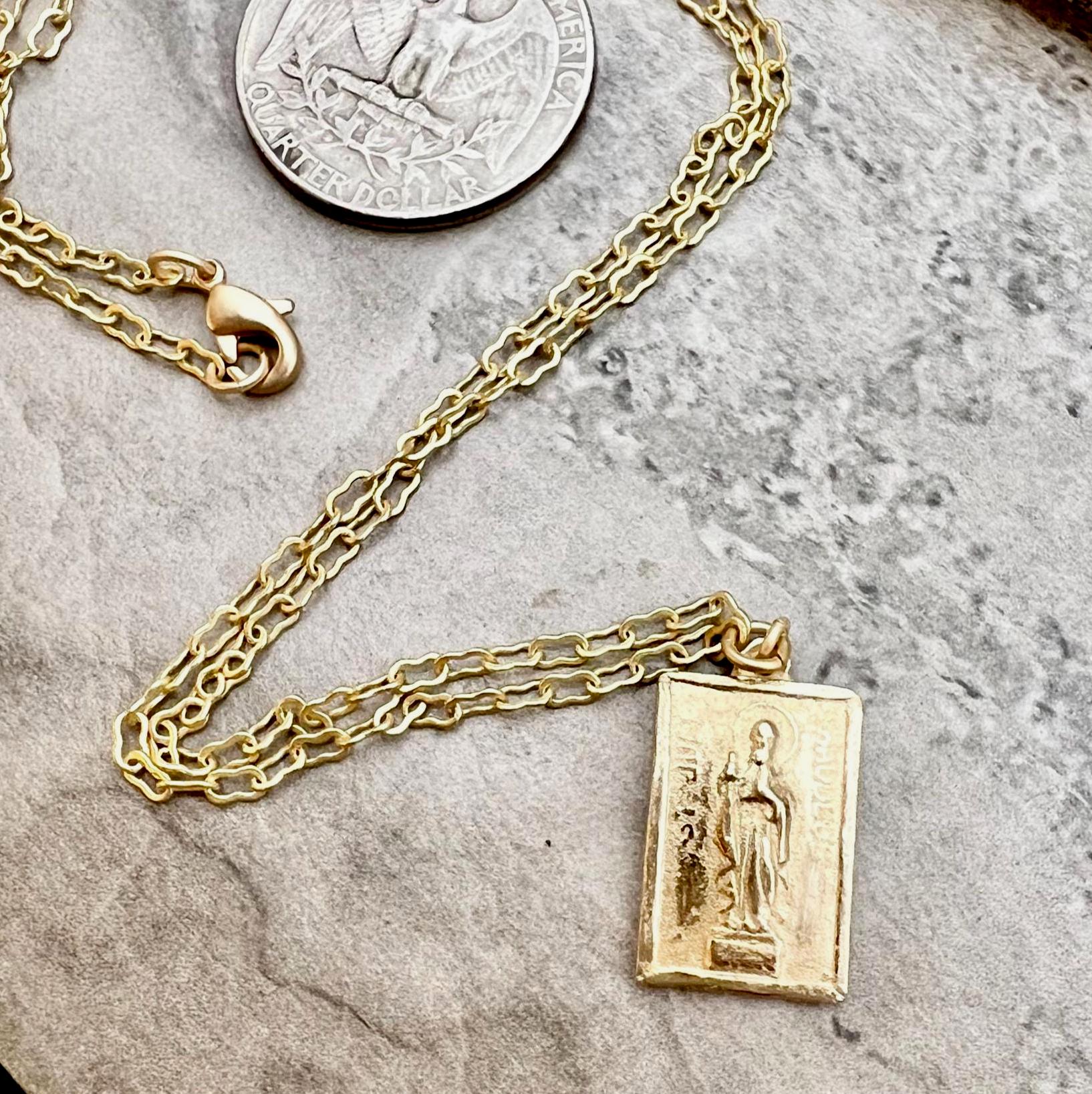 This Saint Jude antique replica necklace carries the quiet beauty and reverence of an old-world devotional medal. The rectangular pendant depicts Saint Jude, patron saint of hope and impossible causes, rendered from an original antique medal and faithfully recreated in my studio.