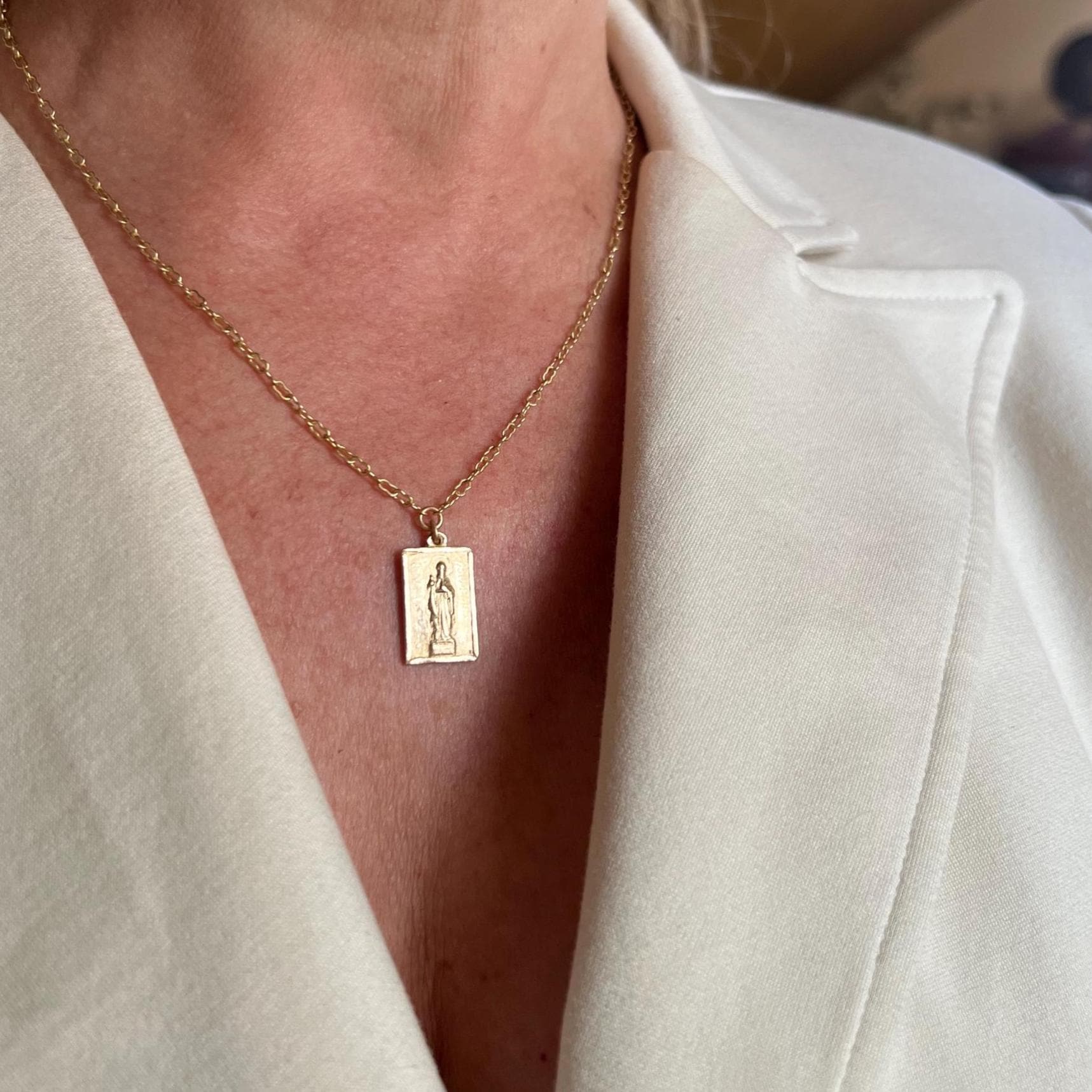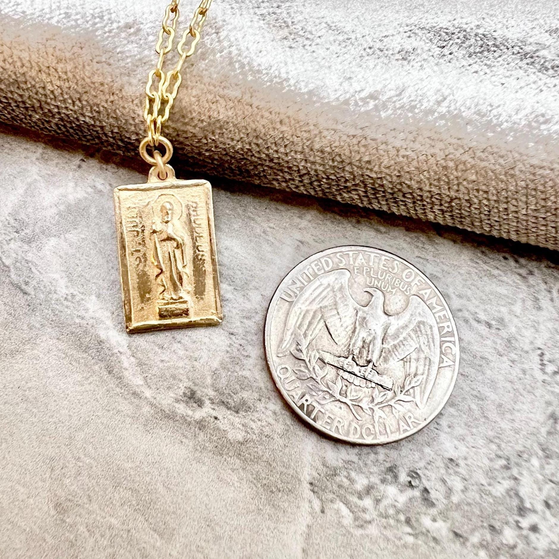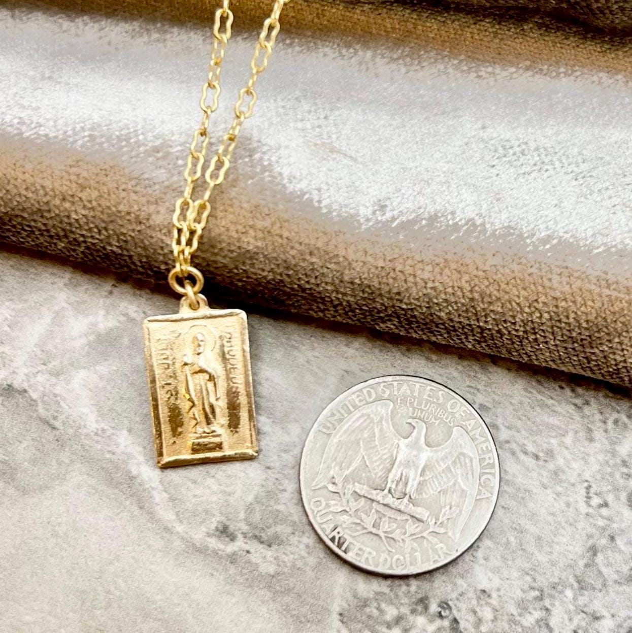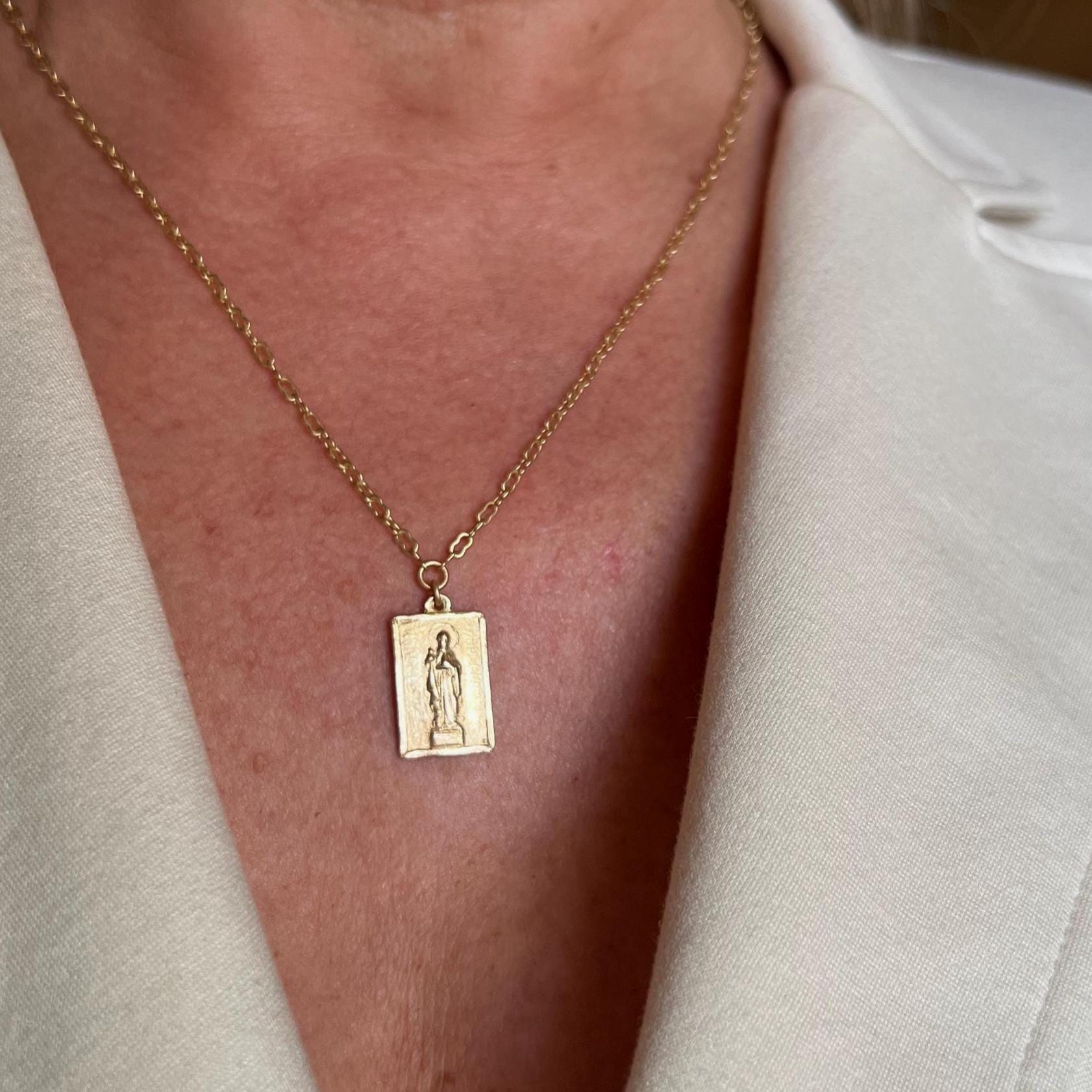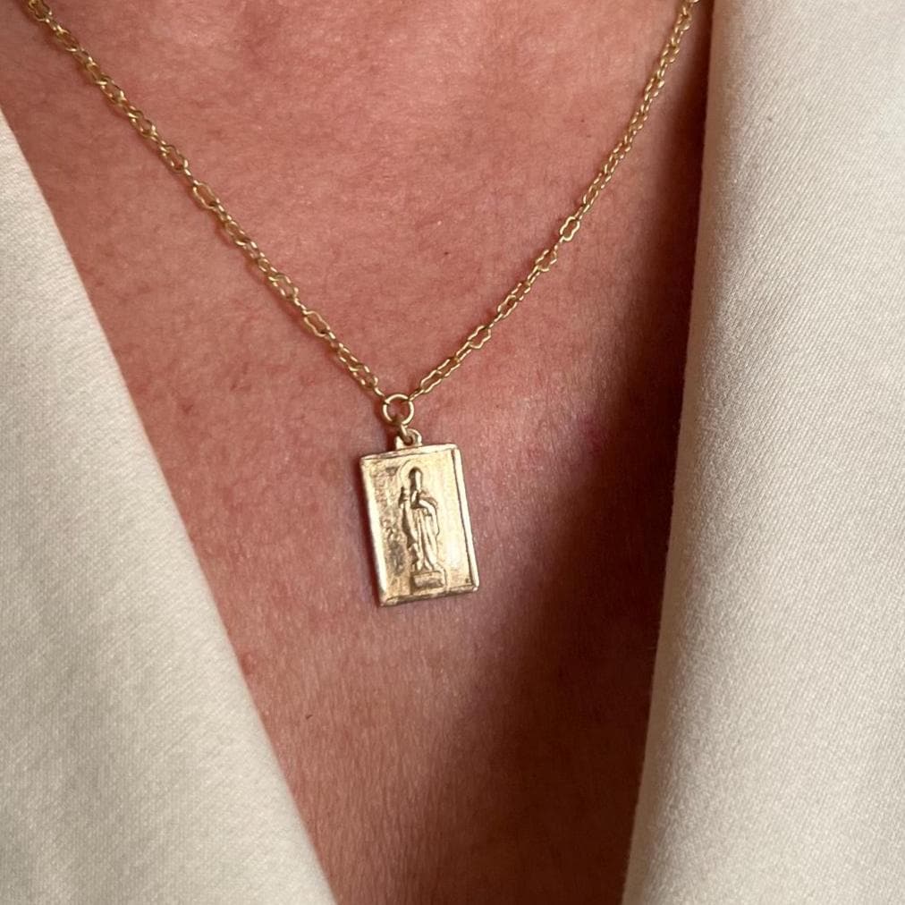 This Saint Jude antique replica necklace carries the quiet beauty and reverence of an old-world devotional medal. The rectangular pendant depicts Saint Jude, patron saint of hope and impossible causes, rendered from an original antique medal and faithfully recreated in my studio.