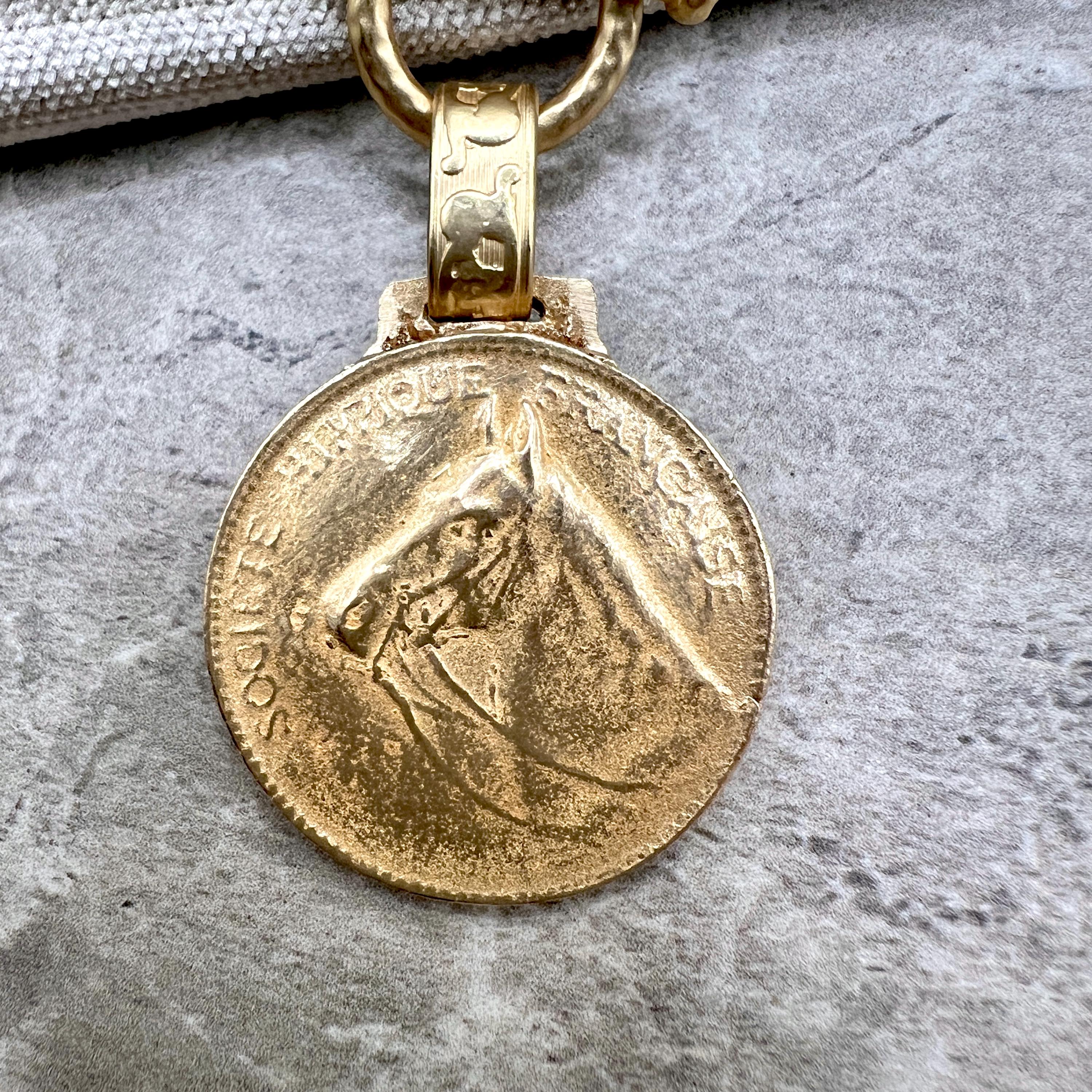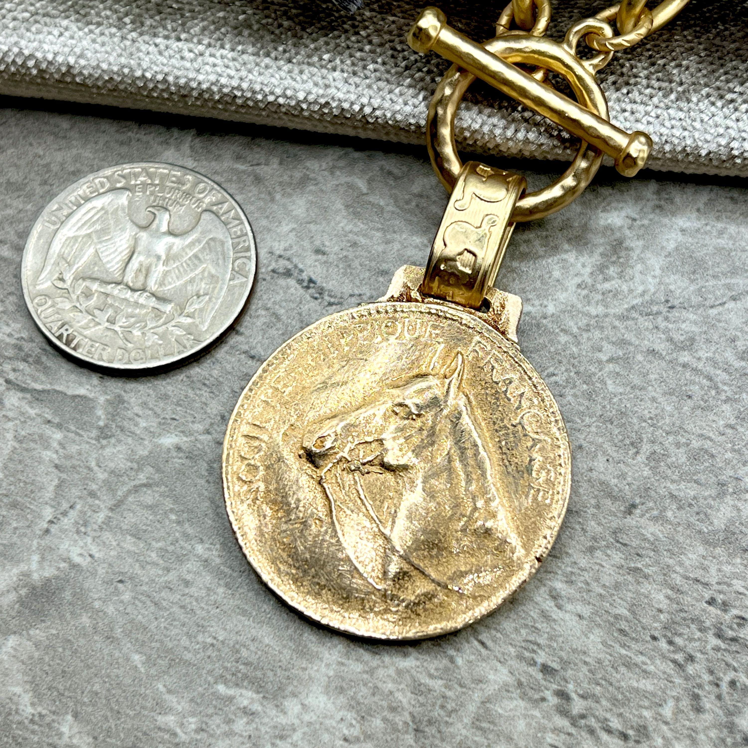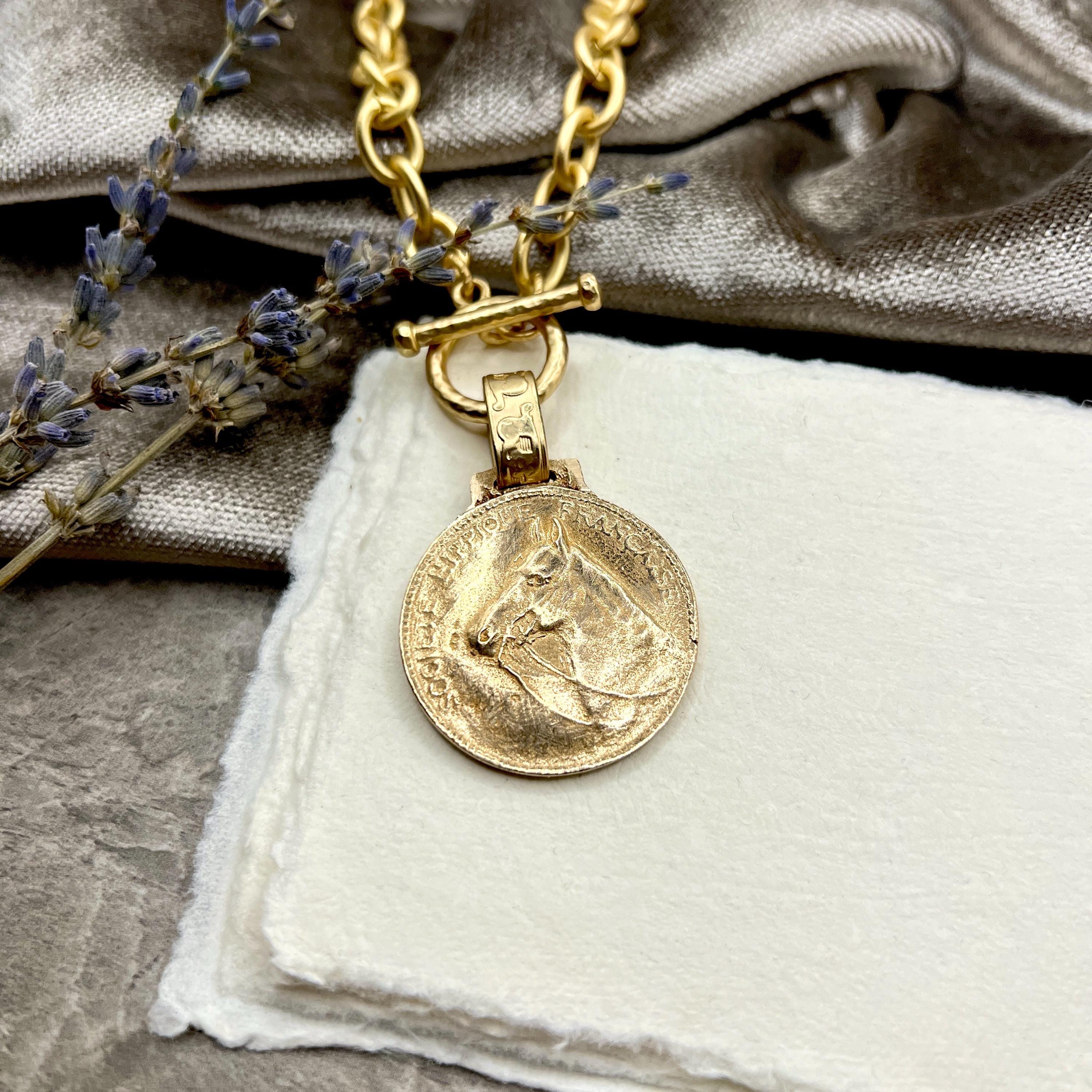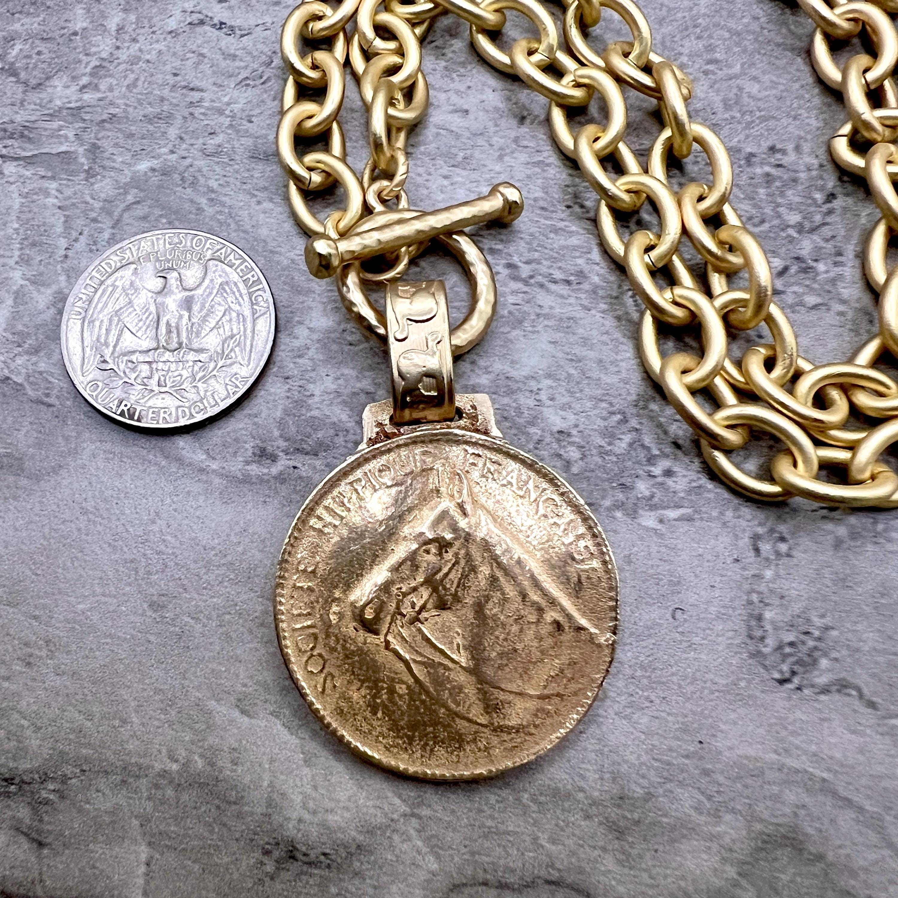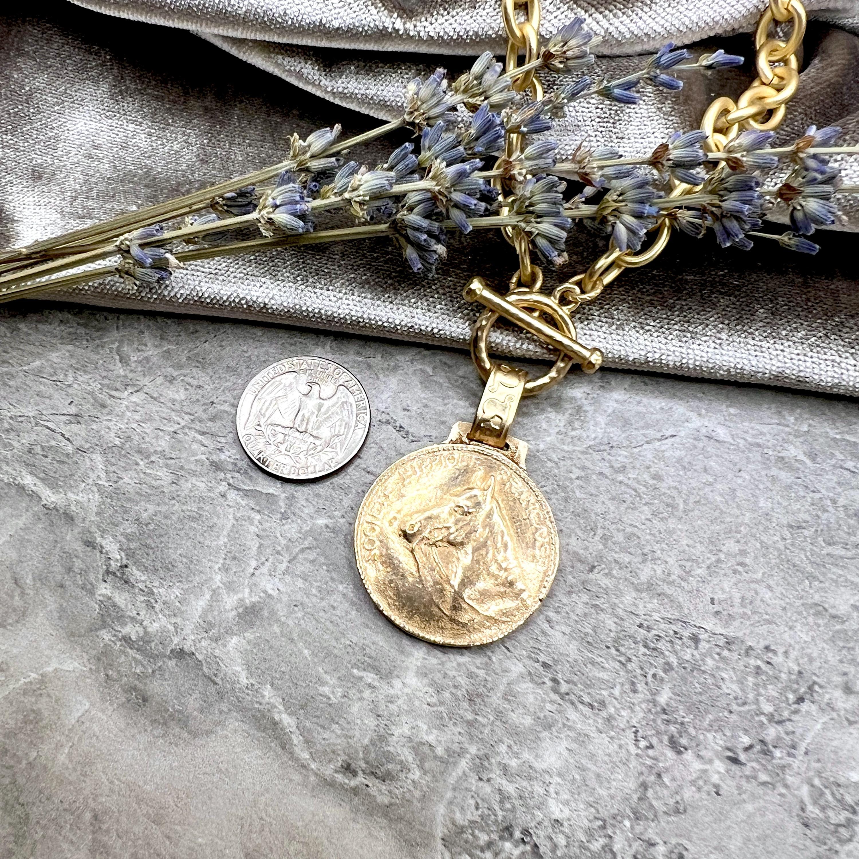 This Antique French Horse Medal Necklace is a bold, handcrafted statement necklace inspired by early 1900s equestrian medals from France. It would make the most treasured gift for a horse lover! The piece features a detailed horse portrait medal inscribed “Société Hippique Française”, faithfully replicated in solid bronze clay and finished by hand in my studio.