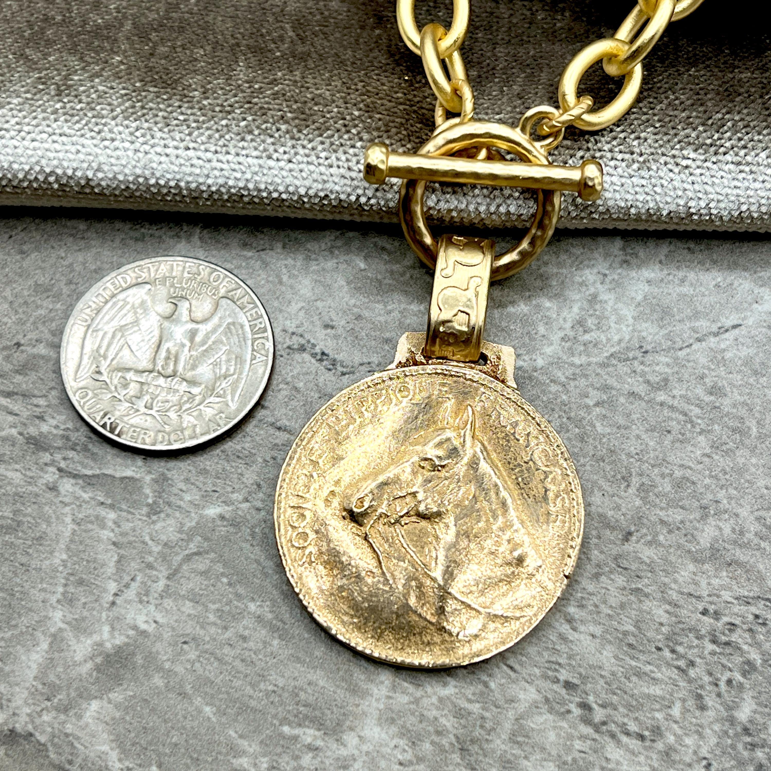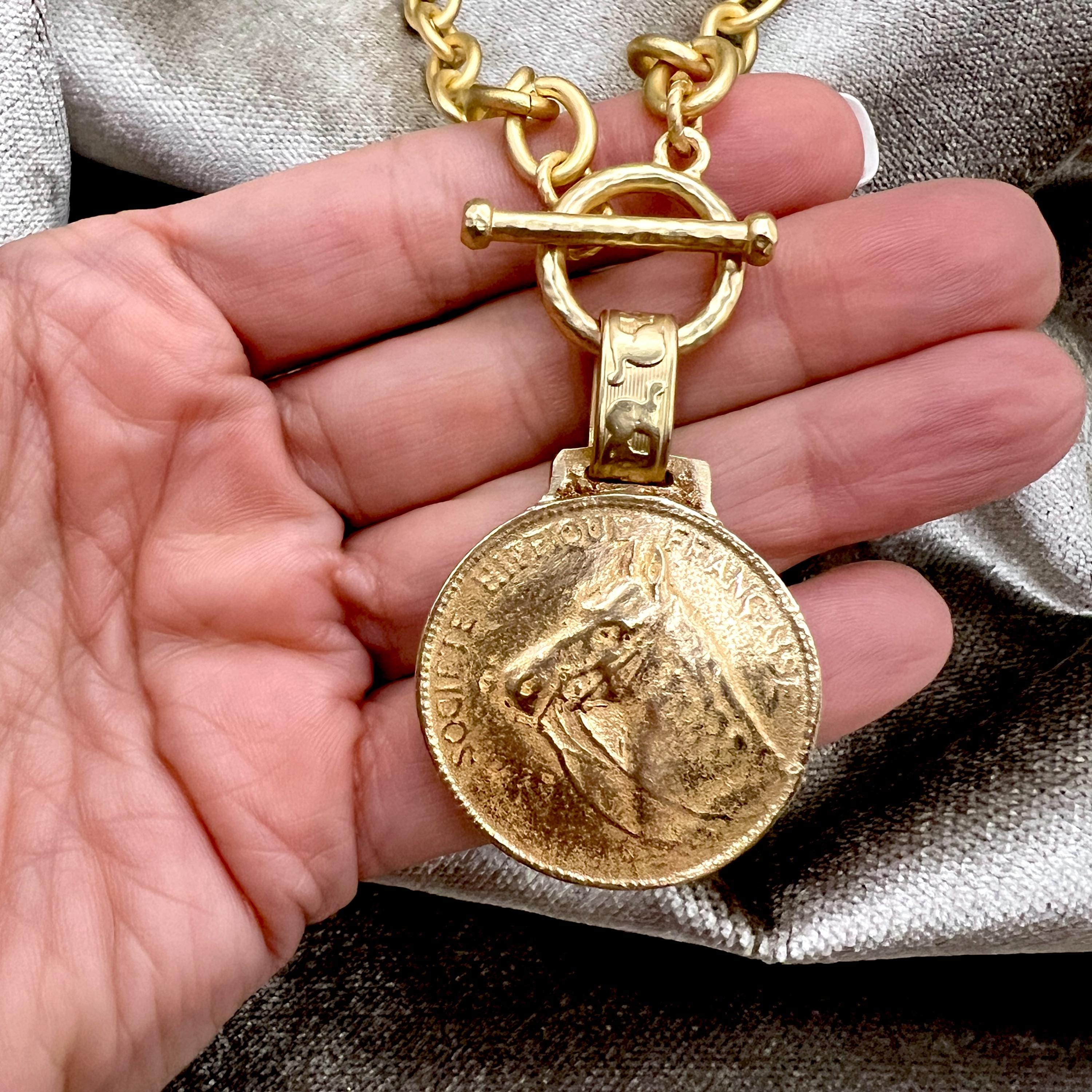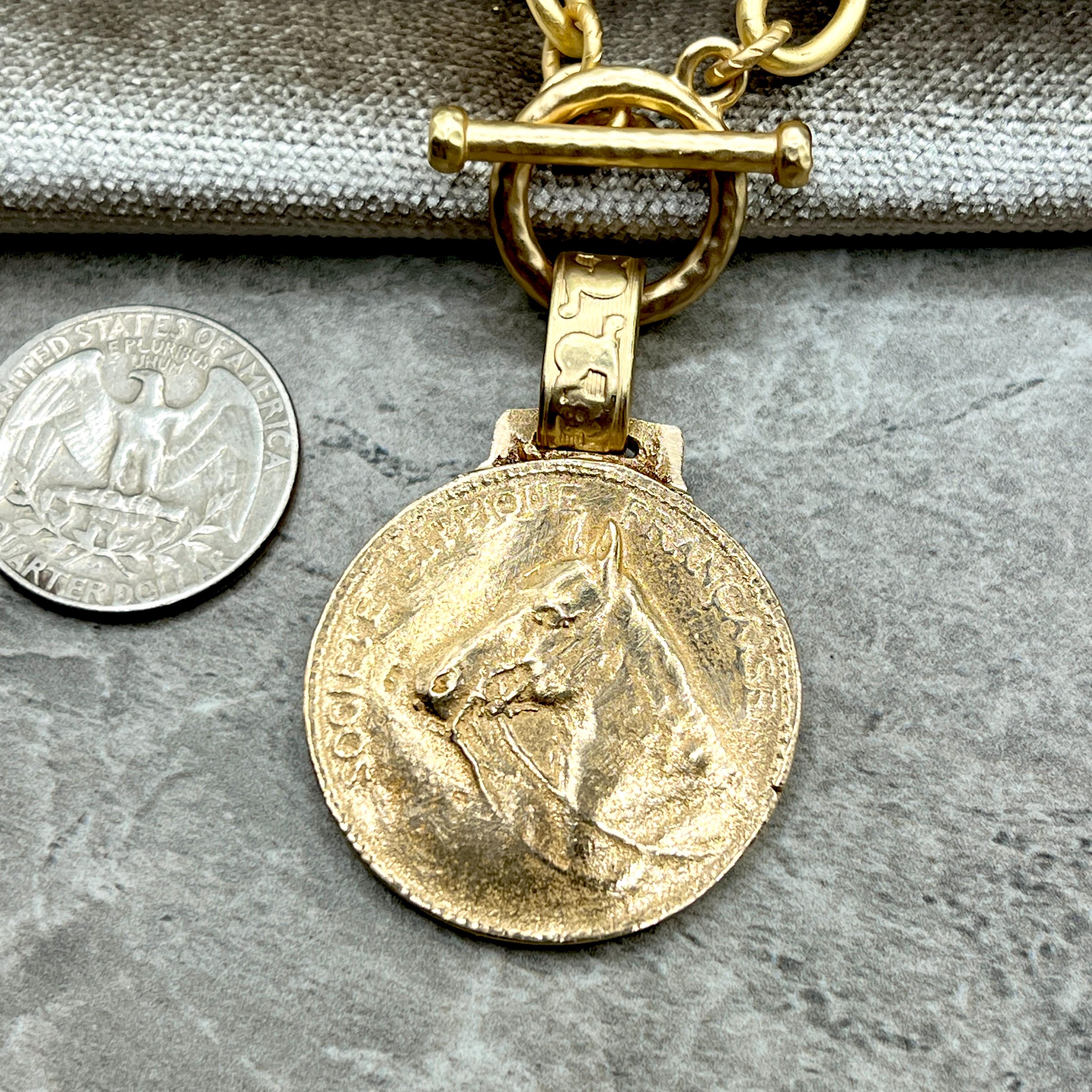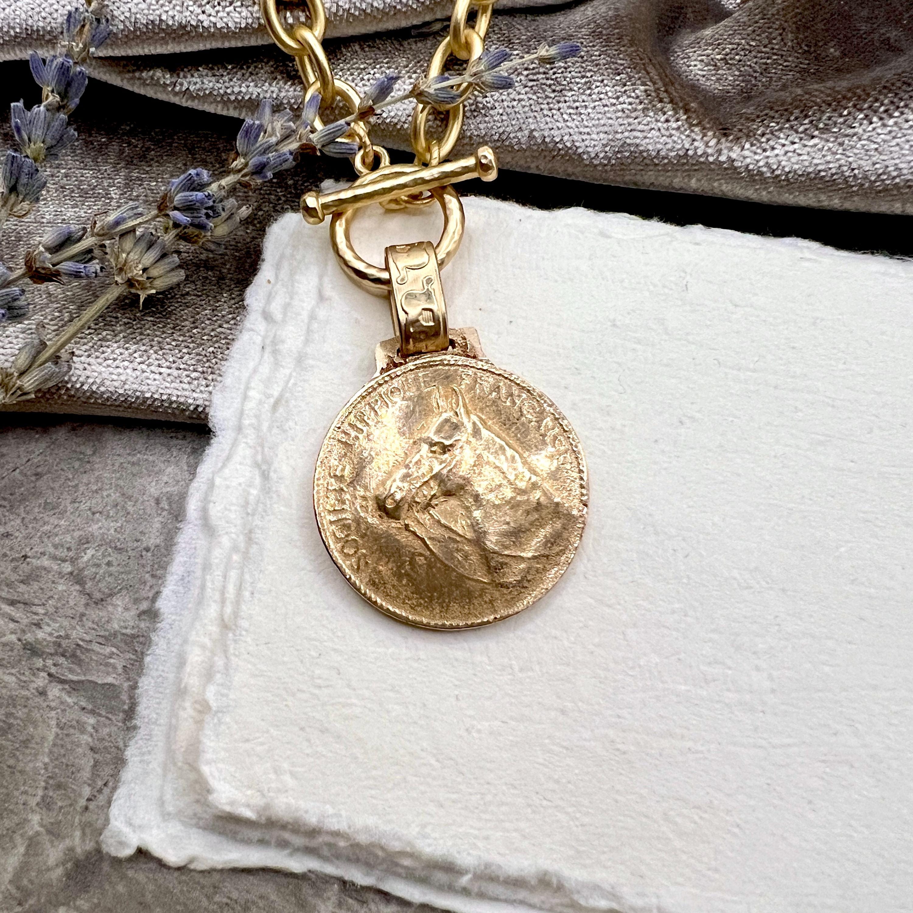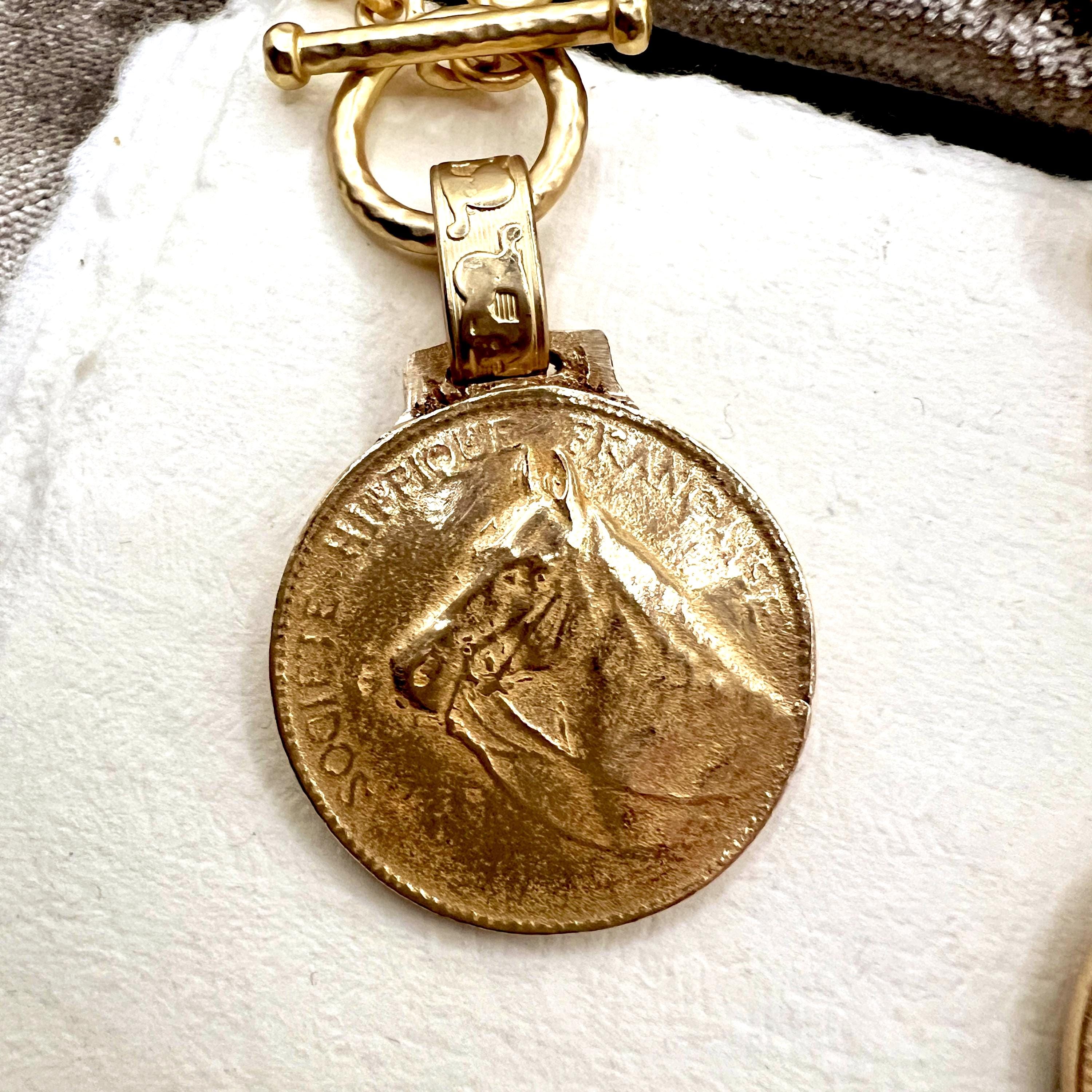 This Antique French Horse Medal Necklace is a bold, handcrafted statement necklace inspired by early 1900s equestrian medals from France. It would make the most treasured gift for a horse lover! The piece features a detailed horse portrait medal inscribed “Société Hippique Française”, faithfully replicated in solid bronze clay and finished by hand in my studio.