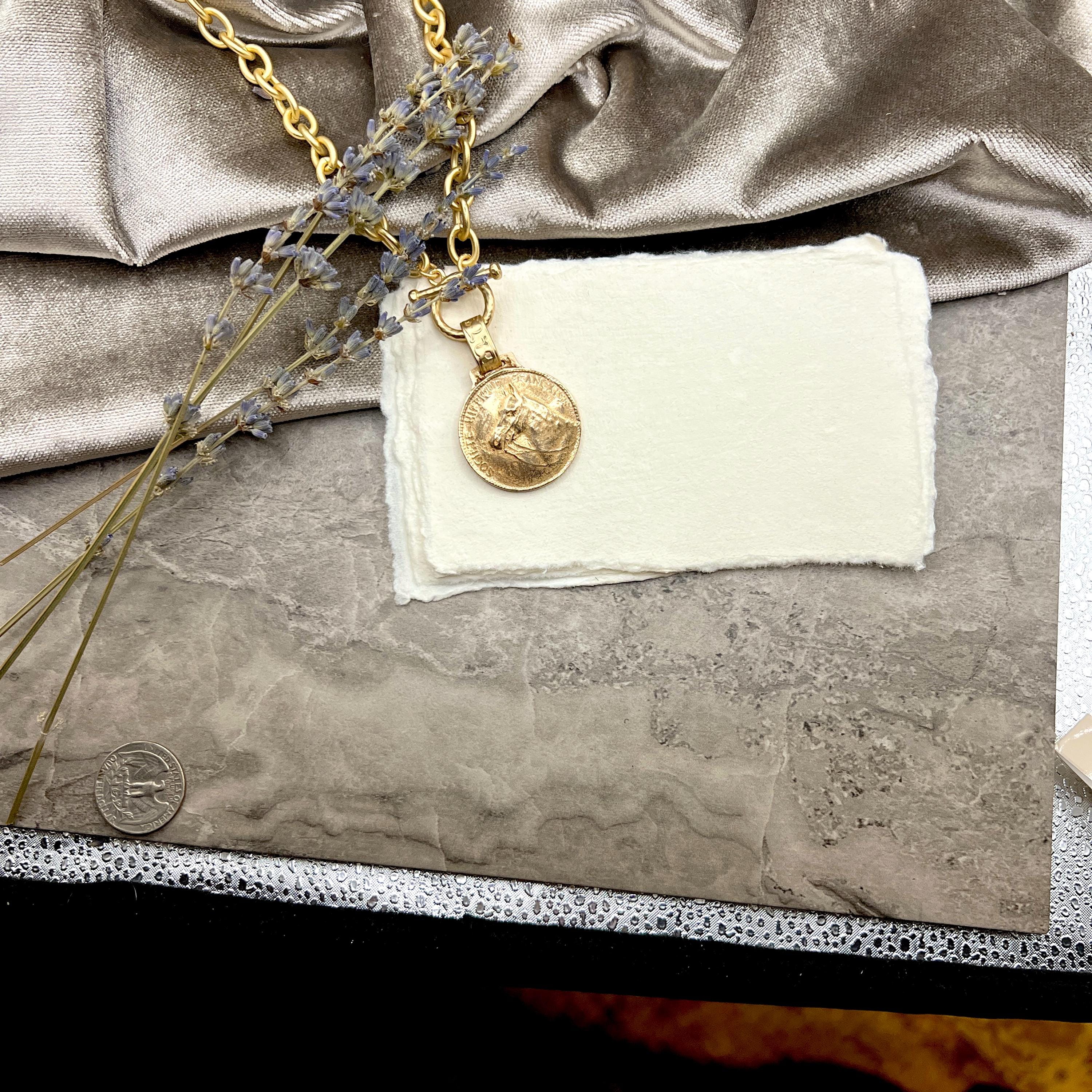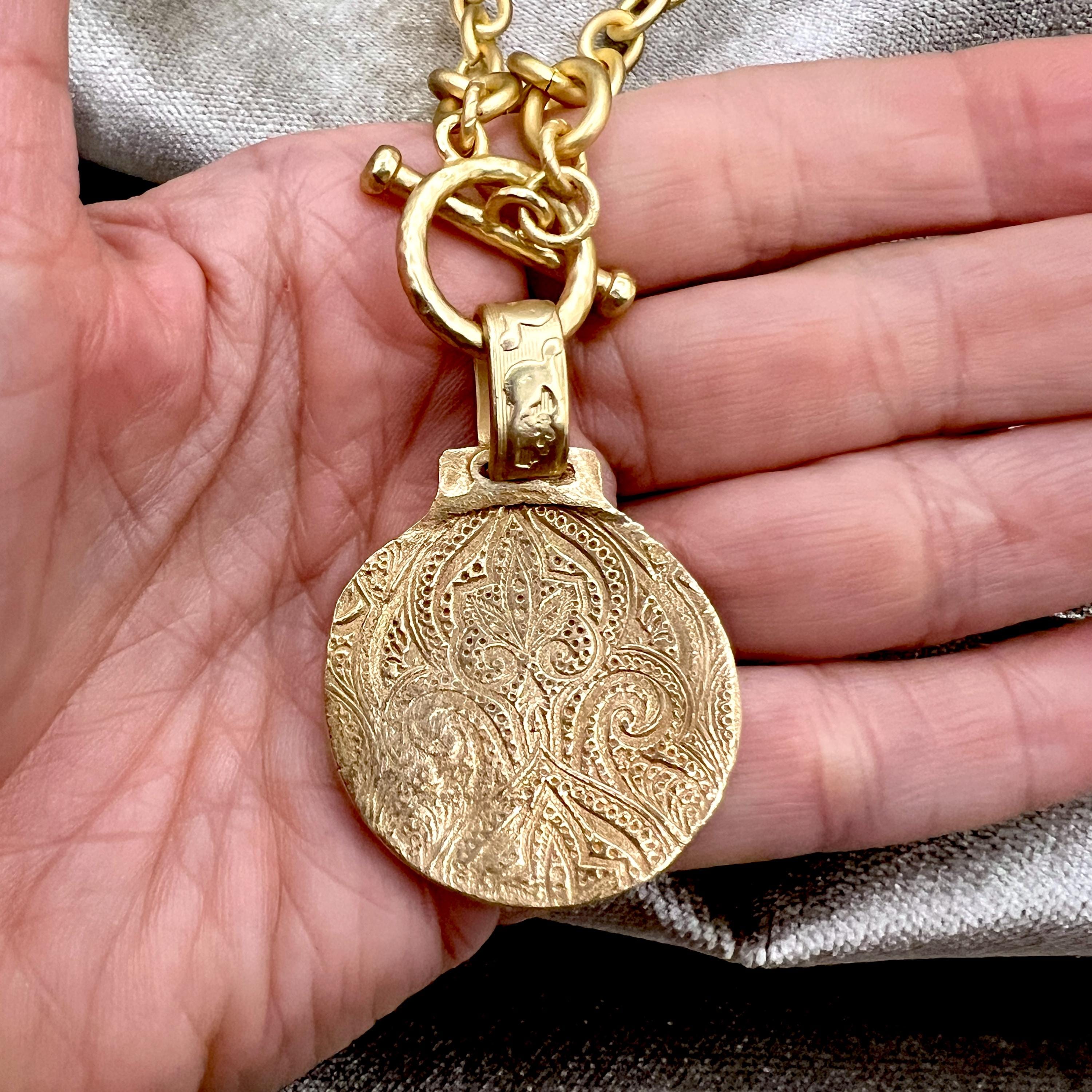 The chunky cable chain adds vintage strength and modern edge, while the etched bail and designer clasp closure give this necklace the look of a luxury piece. Each medal is kiln-fired, polished on raised areas, and left matte in the recessed details to highlight its antique texture and patina.